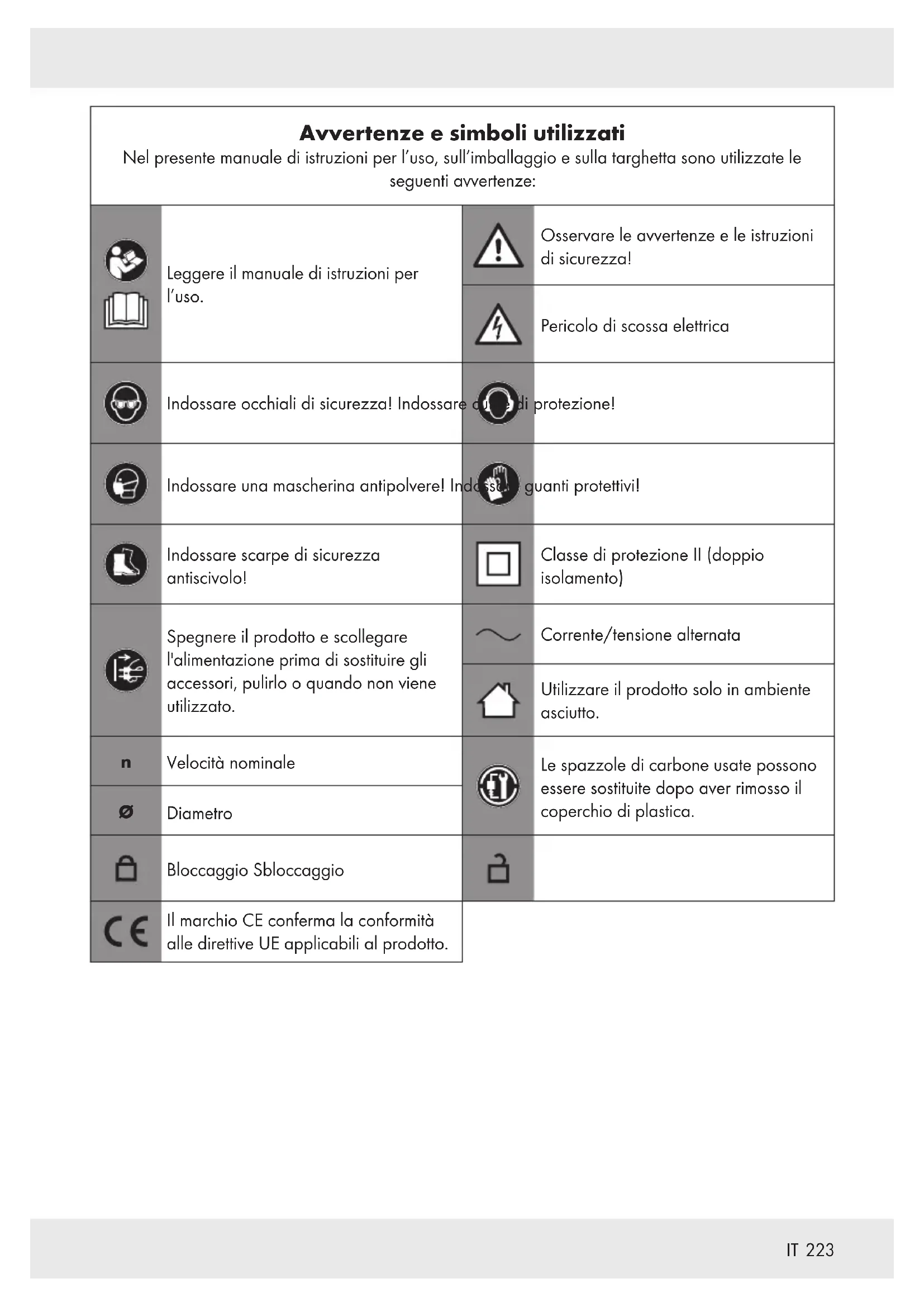 Avvertenze e simboli utilizzati Nel presente manuale di istruzioni per l’uso, sull’imballaggio e sulla targhetta sono utilizzate le seguenti avvertenze: Leggere il manuale di istruzioni per l’uso. Osservare le avvertenze e le istruzioni di sicurezza! Pericolo di scossa elettrica Indossare occhiali di sicurezza! Indossare cuffie di protezione! Indossare una mascherina antipolvere! Indossare guanti protettivi! Indossare scarpe di sicurezza antiscivolo! Classe di protezione II (doppio isolamento) Spegnere il prodotto e scollegare l'alimentazione prima di sostituire gli accessori, pulirlo o quando non viene utilizzato. Corrente/tensione alternata Utilizzare il prodotto solo in ambiente asciutto.