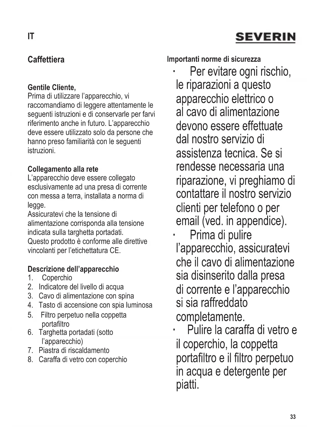 Importanti norme di sicurezza ∙ Per evitare ogni rischio, le riparazioni a questo apparecchio elettrico o al cavo di alimentazione devono essere effettuate dal nostro servizio di assistenza tecnica. Se si rendesse necessaria una riparazione, vi preghiamo di contattare il nostro servizio clienti per telefono o per email (ved. in appendice). ∙ Prima di pulire l’apparecchio, assicuratevi che il cavo di alimentazione sia disinserito dalla presa di corrente e l’apparecchio si sia raffreddato completamente. ∙ Pulire la caraffa di vetro e il coperchio, la coppetta portaltroeilltroperpetuo in acqua e detergente per piatti. IT34 104 x 142 mm ∙ Per informazioni più dettagliate su come pulire l’apparecchio, consultate la sezione Manutenzione e pulizia. ∙ Per evitare eventuali rischi di scosse elettriche, non pulite l’apparecchio con liquidi e non immergetelo in sostanze liquide. ∙ Avvertenza! Il cattivo uso può essere causa di gravi lesioni alla persona. ∙ Attenzione! La piastra elettrica diventa molto calda durante l’uso e resta calda per un certo tempo anche dopo lo spegnimento. ∙ Non utilizzare l’apparecchio in un mobile chiuso. ∙ Questo apparecchio è studiato per il solo uso domestico o per impieghi simili, come per esempio - in cucine per il personale, negozi,ufciealtri ambienti simili di lavoro, - in aziende agricole, - da clienti di alberghi, motel e sistemazioni simili, - da clienti di pensioni “bed- and-breakfast” (letto & colazione). ∙ Il presente apparecchio può essere usato da bambini (di almeno 8 anni di età) e da persone con ridotte capacitàsiche,sensoriali o mentali, o persone senza particolari esperienze o conoscenze, purché siano sotto sorveglianza o siano state date loro istruzioni sull’uso dell’apparecchio e comprendano pienamente i rischi e le precauzioni di sicurezza che l’apparecchio comporta. ∙ Ai bambini non deve essere consentito di giocare con104 x 142 mm