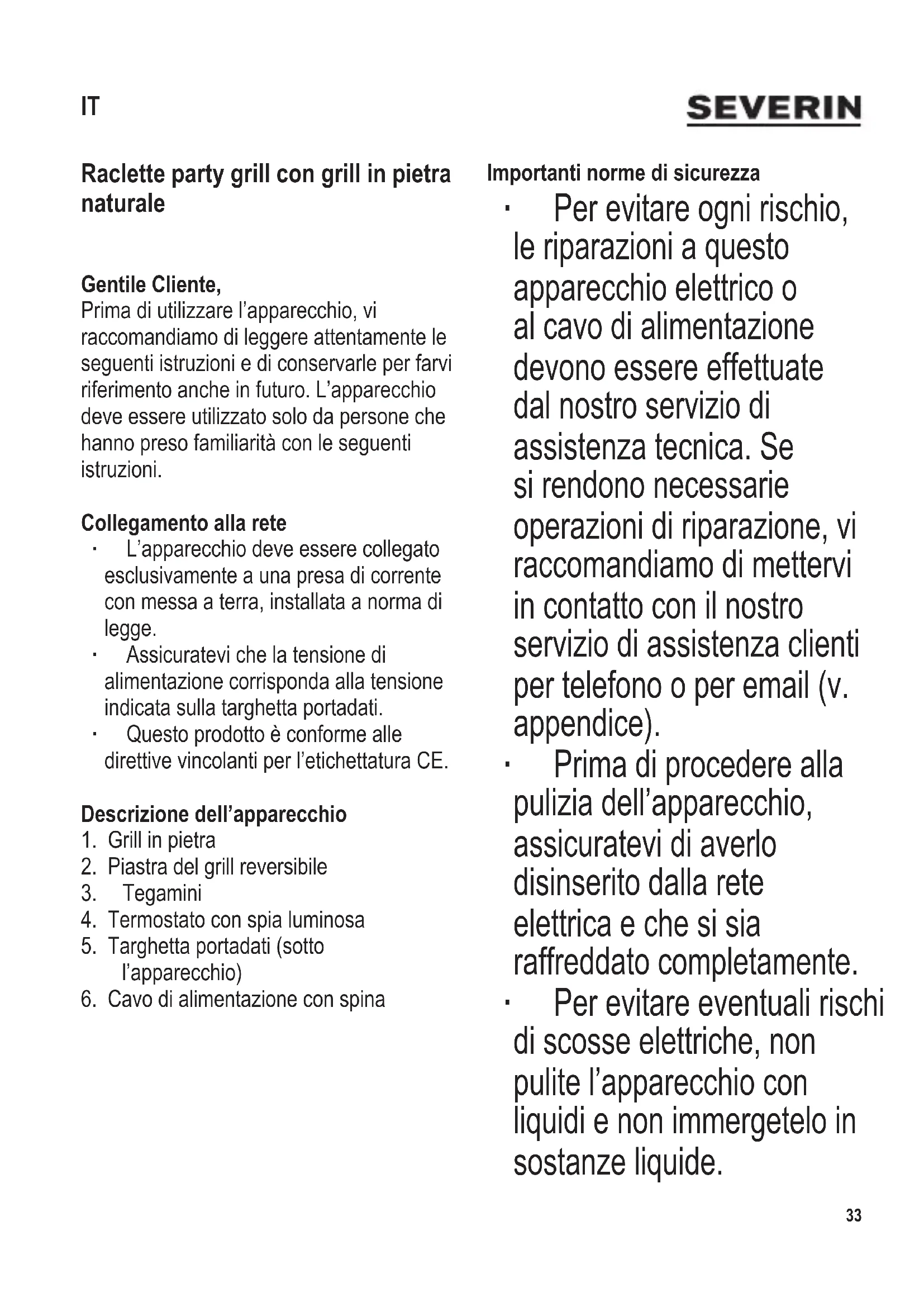 pulizia o di manutenzione sull’apparecchio a meno che non siano supervisionati da un adulto e siano comunque più grandi di 8 anni di età. ∙ L’apparecchio e il cavo di alimentazione devono essere tenuti sempre fuori della portata di bambini di età inferiore agli 8 anni. ∙ Avvertenza: Tutto il materiale di imballaggio deve essere tenuto fuori della portata dei bambini a causa del rischio potenziale esistente, per esempio di soffocamento. ∙ Prima di ogni utilizzo dell’apparecchio, controllate attentamente che l’apparecchio e gli accessori inseriti non presentino tracce di deterioramento. Se per esempio fosse caduto battendo su una supercie dura, o se è stata usata una forza eccessiva nel tirare il cavo di alimentazione, l’apparecchio non va più usato: danni anche invisibili ad occhio nudo potrebbero comportare conseguenze negative sulla sicurezza nel funzionamento dell’apparecchio. ∙ Le superci esterne dell’apparecchio, la piastra del grill reversibile, il grill in pietra e i tegamini diventano molto caldi durante il funzionamento e rimangono caldi anche per un certo tempo dopo. Avvertenza: Esiste il pericolo di procurarsi ustioni. ∙ Non lasciate l’apparecchio incustodito durante l’uso. ∙ Il cavo di alimentazione non deve toccare le parti dell’apparecchio soggette a riscaldarsi. ∙ Durante il funzionamento, l’apparecchio deve essere installato su una supercie stabile, piana e resistente al calore, impermeabile agli spruzzi e antimacchia: non è sempre possibile evitare schizzi durante la cottura di cibi ad alto tenore di grasso o di sostanze liquide. ∙ Non mettete il grill vicino a una parete o in un angolo e assicuratevi che tutt’intorno non ci siano materiali inammabili. ∙ Non installate l’apparecchio vicino a superci calde o a contatto diretto con amme libere o in prossimità di vapori inammabili. ∙ Attenzione: Non utilizzate l’apparecchio all’aperto. ∙ Prima dell’uso, sistemate la piastra del grill reversibile e il grill in pietra sull’apparecchio, sopra l’elemento riscaldante.36 104 x 142 mm ∙ Disinserite sempre la spina dalla presa - dopo l’uso, - in caso di cattivo funzionamento, - prima di pulire l’apparecchio. ∙ Per disinserire la spina dalla presa di corrente, non tirate mai il cavo di alimentazione, ma afferrate direttamente la spina. ∙ Nessuna responsabilità verrà assunta in caso di danni risultanti da un uso errato o dalla non conformità alle istruzioni. Funzionalità Questo apparecchio è un grill elettrico per raclette, adatto per grigliare carni magre, pesci e ortaggi e per preparare formaggi “au gratin”. Ogni altro utilizzo diverso da quello descritto in questo manuale è da considerarsi improprio e può portare a lesioni personali o a danni materiali. Primo utilizzo ∙ Eliminate completamente tutto il materiale di imballaggio. ∙ Prima di mettere in uso il grill per la prima volta, pulite la piastra del grill reversibile, il grill in pietra e i tegamini con un panno umido. ∙ Fate preriscaldare l’apparecchio con la pietra / piastra e i tegamini per circa 10 minuti senza aggiungere alimenti: questo accorgimento servirà ad eliminare il cattivo odore tipico emesso da un grill alla sua prima messa in funzione. È possibile che si diffonda un po’ di fumo. È bene quindi assicurare una buona aerazione lasciando aperte porte e nestre. ∙ In seguito pulite l’apparecchio seguendo le istruzioni indicate nella sezione Manutenzione e pulizia. Grill in pietra ∙ Prima di ogni utilizzo, inserite sull’apparecchio la pietra con il lato liscio rivolto verso l’alto, vicino alla piastra reversibile di grigliatura, accertandovi che gli angoli arrotondati siano rivolti verso l’esterno. Avvertenza: Evitate di mettere la pietra fredda sull’elemento riscaldante già caldo. ∙ La pietra può essere usata per preparare ortaggi, fettine di carne, letti di pesce e altro. ∙ La pietra è un materiale assolutamente naturale. È possibile che presenti piccole incrinature causate dalla normale espansione e contrazione del materiale durante le fasi di riscaldamento e di raffreddamento o che acquisti una colorazione più scura: ciò è del tutto normale e non comporta nessun effetto dannoso. ∙ Non mettete mai sulla pietra alimenti congelati o che contengono aceto (p. es. cetriolini sottaceto o senape). Piastra di grigliatura reversibile ∙ Prima di ogni utilizzo, inserite sull’apparecchio la piastra di grigliatura reversibile vicino alla pietra, accertandovi che gli angoli arrotondati siano rivolti verso l’esterno. ∙ Con il lato a nervature rivolto verso l’alto, la piastra del grill può essere usata per grigliare carne, salsicce e104 x 142 mm
