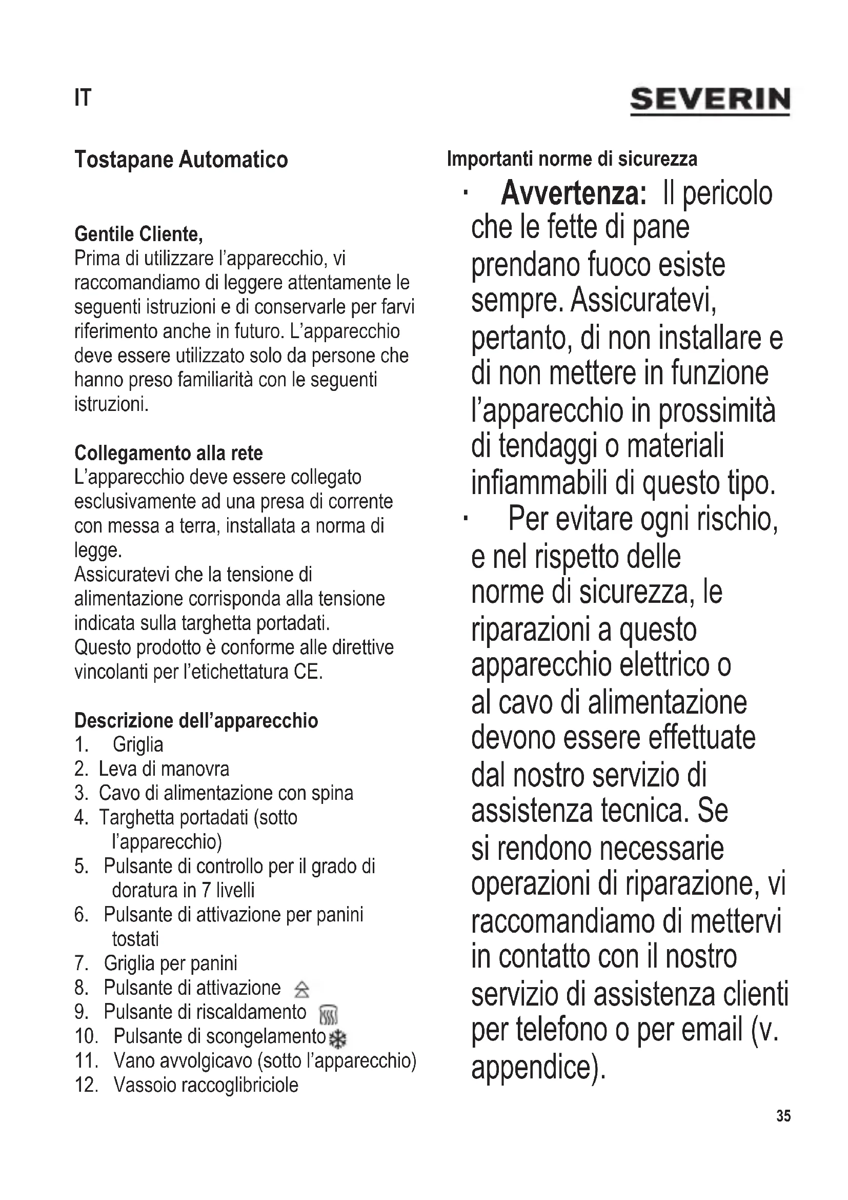 fenomeni scompariranno dopo un breve periodo. È bene però assicurare una buona aerazione lasciando aperte porte enestre. Spegnimento automatico Questo apparecchio è dotato di un dispositivo per lo spegnimento automatico. Se la fetta di pane si incastra e non esce fuoriallanedelcicloditostatura,il tostapane si spegne automaticamente. In questo caso, disinserite l’apparecchio dalla rete elettrica e togliete la fetta di pane dall’apparecchio secondo quanto descritto nella sezione Dati generali. Regolazione del livello di tostatura ∙ Il grado di doratura desiderato può essere impostato in 7 livelli tramite la manopola di controllo: Colore chiaro: girate il regolatore in senso antiorario. Colore scuro: girate il regolatore in senso orario. ∙ Seutilizzatefettedipanespecicoper la preparazione di toast, vi consigliamo di impostare il regolatore di doratura sulla posizione 4. Funzionamento ∙ Inserite la spina nella presa di corrente. ∙ Dopo aver regolato il livello di tostatura, inserite la fetta nella fessura per il pane e premete la leva di manovra. ∙ La spia luminosa sul tasto di espulsione ( ) si accende. ∙ Al raggiungimento del livello di tostatura desiderato, il tostapane si spegne automaticamente e le fette di pane sono espulse. La spia luminosa si spegne. ∙ Per ottenere una doratura uniforme durante la tostatura più volte, riempire entrambe le griglie e attendere circa ½ minuto dopo ogni tostatura. Funzione scongelamento Oltre al normale funzionamento dell’apparecchio, potete utilizzare anche la funzione scongelamento ( ) se il pane è surgelato. Questo renderà più lungo il processo di tostatura. La funzione scongelamento è indicata da una apposita spia luminosa. Funzione scaldavivande La funzione scaldavivande ( ) è adatta per riscaldare il pane già tostato in precedenza. Avvertenza: Non riscaldate del pane imburrato. Dopo aver attivato la funzione tostatura, potete utilizzare anche la funzione riscaldamento. Tale funzione viene segnalata dall’apposita spia luminosa. Interruzione del ciclo di tostatura Per interrompere il ciclo di tostatura, premete il tasto di espulsione ( ). Il tostapane si spegnerà e le fette verranno espulse. La spia luminosa si spegne. Per riscaldare focaccine, panini, ecc. ∙ Per cuocere i panini, premere il pulsante di attivazione della griglia per panini verso il basso. La griglia per panini si alza. ∙ Ponetevi sopra i prodotti da riscaldare, regolate il regolatore del livello di doratura in posizione media e premete40 104 x 142 mm poi la leva di manovra per accendere il tostapane. ∙ Una volta compiuto il ciclo di doratura, e quando l’apparecchio si è ormai spento automaticamente, voltate il panino e ripetete il ciclo. ∙ Per piegare la griglia, premere il pulsante verso l’alto. La griglia viene quindi nuovamente appoggiata sul tostapane. ∙ Non ponete i prodotti direttamente sopra la fessura per il pane. Manutenzione e pulizia In generale ∙ Prima di procedere alle operazioni di pulizia, assicuratevi di aver disinserito la spina dalla presa di corrente e aspettate che l’apparecchio si sia raffreddato completamente. ∙ Per evitare eventuali rischi di scosse elettriche, non pulite l’apparecchio con liquidi e non immergetelo in sostanze liquide. ∙ Non usate soluzioni abrasive o detergenti concentrati. ∙ Lasupercieesternapuòesserpulita con un panno non lanuginoso asciutto o leggermente umido. ∙ Pulire la griglia per panini con un panno leggermente umido. Il vassoio raccoglibriciole Le briciole che cadono dal pane durante l’uso vengono raccolte nel vassoio raccoglibriciole. Per rimuovere le briciole, tirate lateralmente il vassoio e vuotatelo. Ma ricordatevi di rimettere in sede il vassoio raccoglibriciole prima di riutilizzare l’apparecchio. Sistemazione del cavo di alimentazione Prima dell’uso srotolate completamente il cavo di alimentazione e badate a tenerlo sempre lontano dall’apparecchio. Prevedeteunperiodosufcientedi raffreddamento dopo l’uso prima di riavvolgere il cavo di alimentazione. Smaltimento Gli apparecchi contrassegnati con questo simbolo devono essere smaltiti separatamente dai normaliriutidomesticiperché contengono materiali di valore che possono essere riciclati. Lo smaltimento adeguato protegge l’ambiente e la salute umana. Le autorità locali o il negoziante di riferimento possono fornire ulteriori informazioni in materia. Dichiarazione di garanzia La garanzia sui nostri prodotti ha validità di2annidalladatadivendita(certicata dascontrinoscale)ecomprendegli eventuali difetti del materiale o di particolari di costruzione. I danni derivanti da un uso improprio, rotture da caduta o similari non vengono riconosciuti. La presente garanzia non pregiudica i vostri diritti legali, né i diritti acquisiti in quanto consumatore e riconosciuti dalla legislazione nazionale vigente che disciplina l‘acquisto di beni. La garanzia decade nel momento in cui gli apparecchi vengono aperti o manomessi da Centri non da noi autorizzati.104 x 142 mm