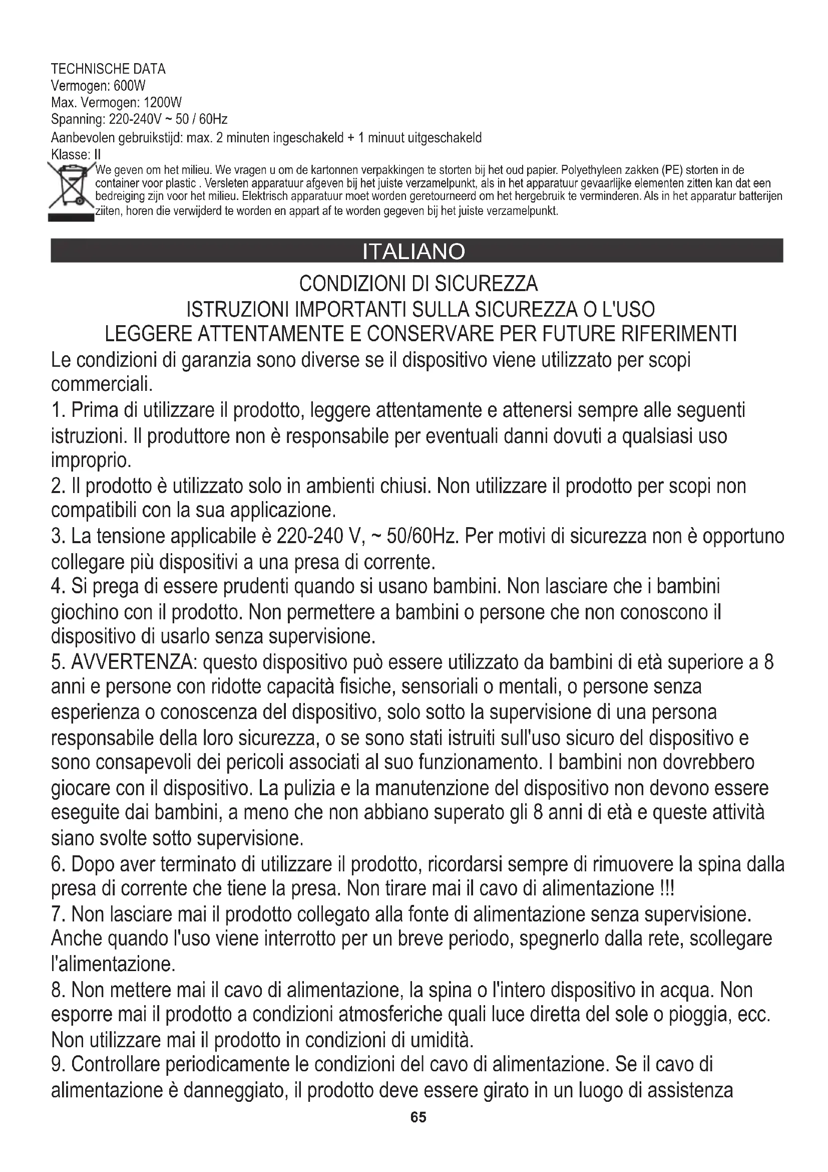 ili na bilo koji drugi način oštećen ili ako ne radi ispravno. Ne pokušavajte sami popraviti neispravan proizvod jer to može dovesti do strujnog udara. Oštećeni uređaj uvijek pretvarajte u profesionalni servisni prostor kako biste ga popravili. Sve popravke mogu obaviti samo ovlašteni serviseri. Neispravan popravak može uzrokovati opasne situacije za korisnika. Prendersi cura dell'ambiente Non gettare l'apparecchio nei contenitori dei rifiuti urbani! Gli imballi di cartone devono essere smaltiti nel contenitore per la carta. I sacchetti di polietilene (PE) vanno gettati nel contenitore per la plastica. L'apparecchio usato deve essere rottamato presso un centro di raccolta autorizzato, poiché contiene elementi pericolosi che potrebbero costituire una minaccia per l'ambiente. I dispositivi elettrici devono essere resi al fine di evitare il loro riutilizzo. Se il dispositivo contiene una batteria, deve essere rimossa e smaltita separatamente in un punto di raccolta. Tempo operativo consigliato: massimo 2 minuti acceso + 1 minuto spento Voltaggio: 220-240 V ~ 50/60 Hz Classe: II69
