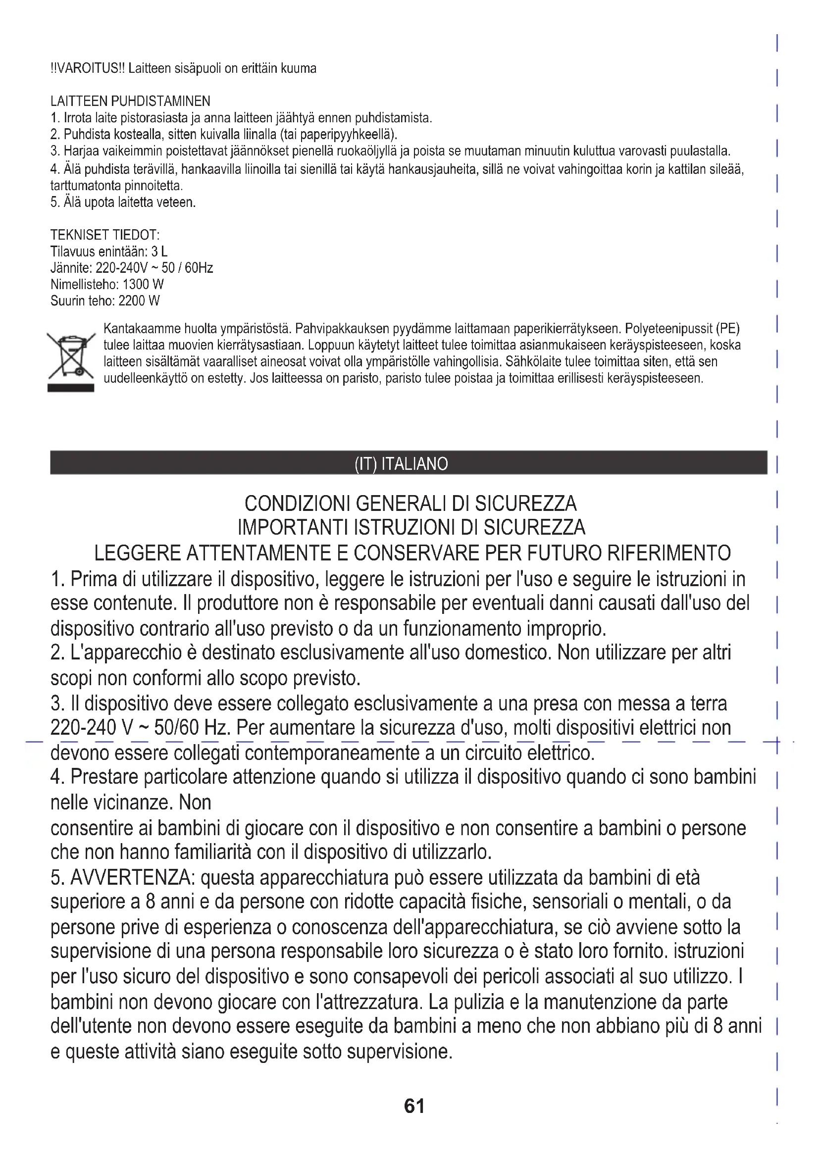 DATI TECNICI: Potenza nominale: 1300 W Disporre i pezzi di cibo in modo che l'aria calda scorra liberamente tra di loro. Esempi: (Tempo e temperatura di cottura indicativi) Bistecca: tempo 20 minuti / temperatura 170 ˚C Tensione: 220-240V ~50/60Hz Pesce: tempo 20 minuti / temperatura 190 ˚C Prendersi cura dell'ambiente Gli imballi di cartone devono essere smaltiti nel contenitore per la carta. I sacchetti di polietilene (PE) vanno gettati nel contenitore per la plastica. L'apparecchio usato deve essere rottamato presso un centro di raccolta autorizzato, poiché contiene elementi pericolosi che potrebbero costituire una minaccia per l'ambiente. I dispositivi elettrici devono essere resi al fine di evitare il loro riutilizzo. Se il dispositivo contiene una batteria, deve essere rimossa e smaltita separatamente in un punto di raccolta. Non gettare l'apparecchio nei contenitori dei rifiuti urbani!