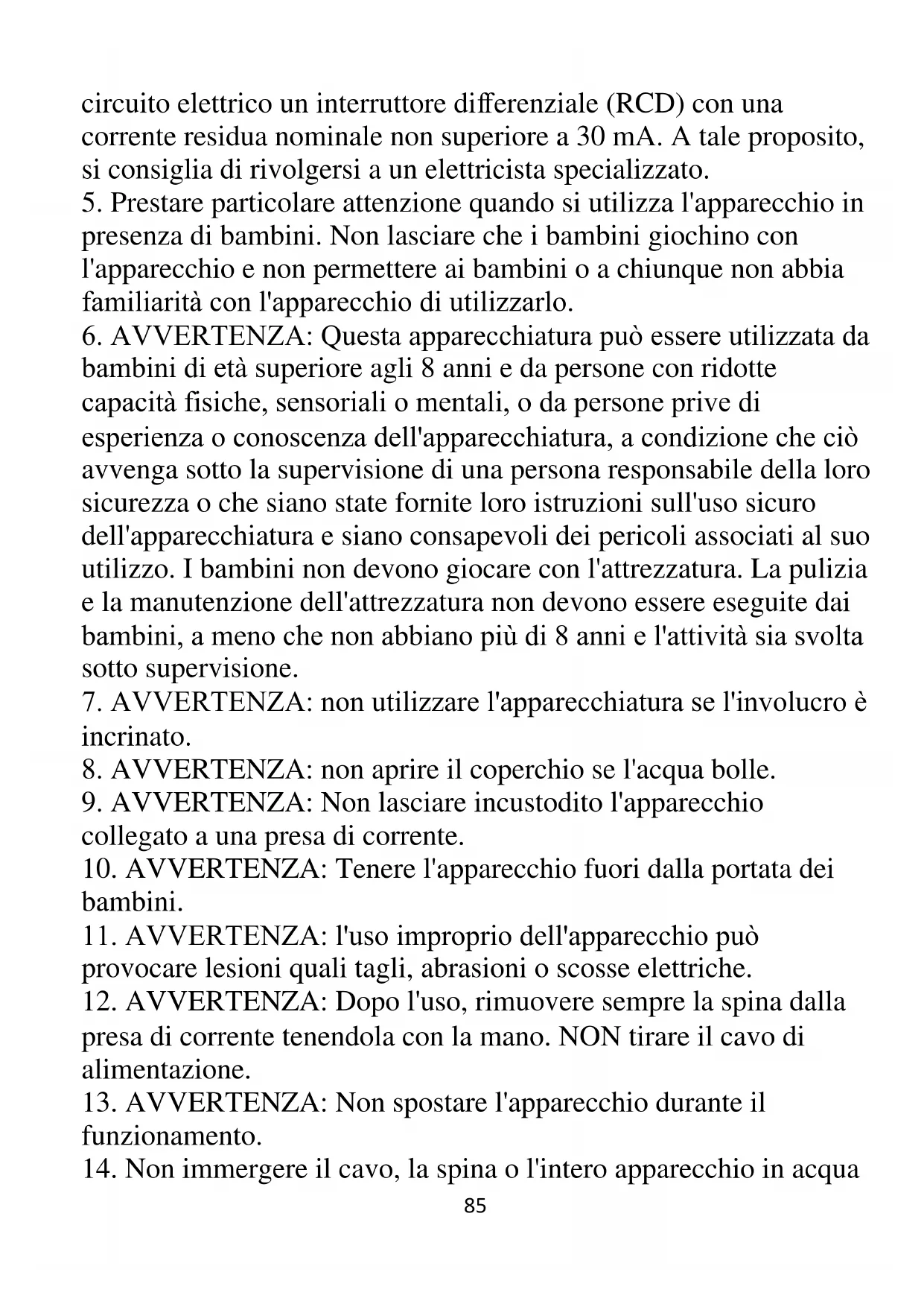 14. Non immergere il cavo, la spina o l'intero apparecchio in acqua86