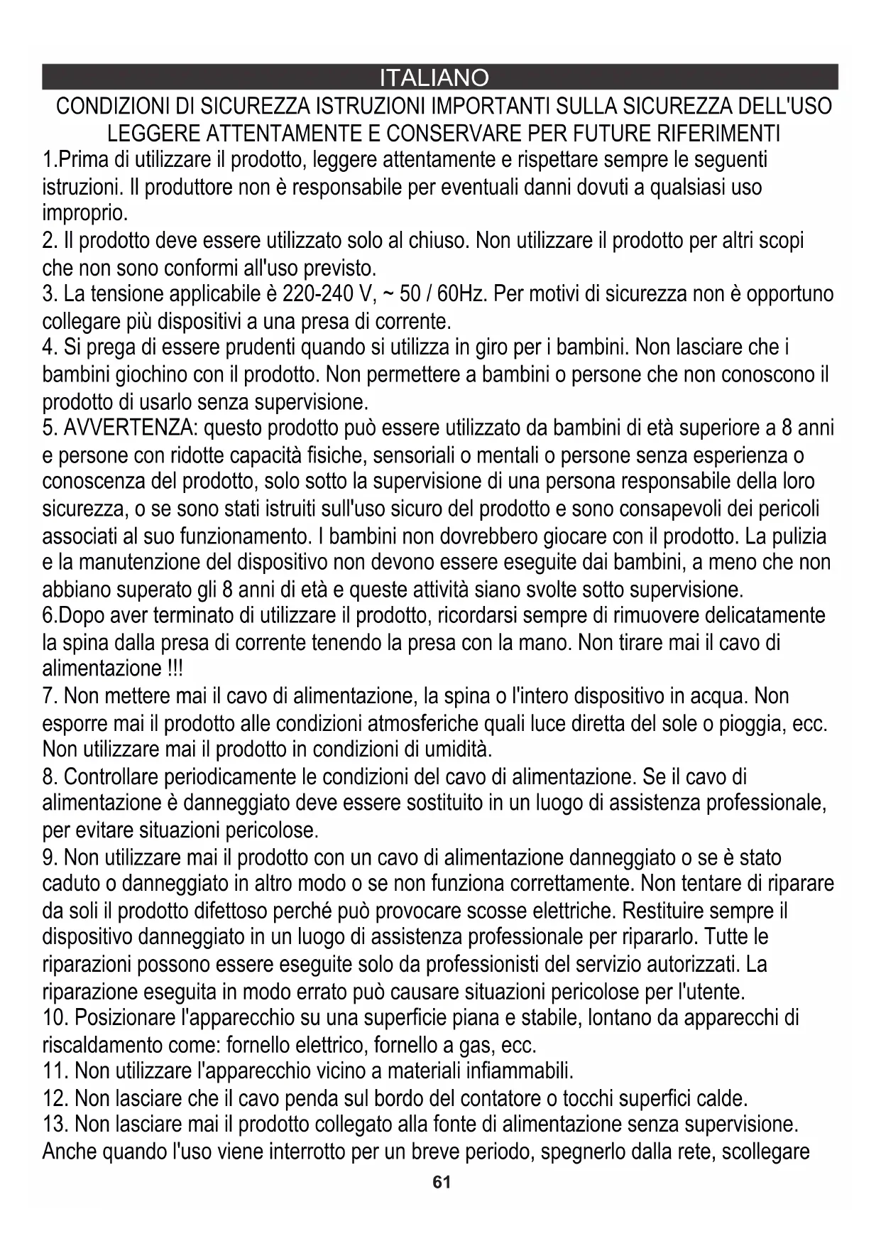 19. Il prodotto deve essere spento dopo ogni utilizzo.