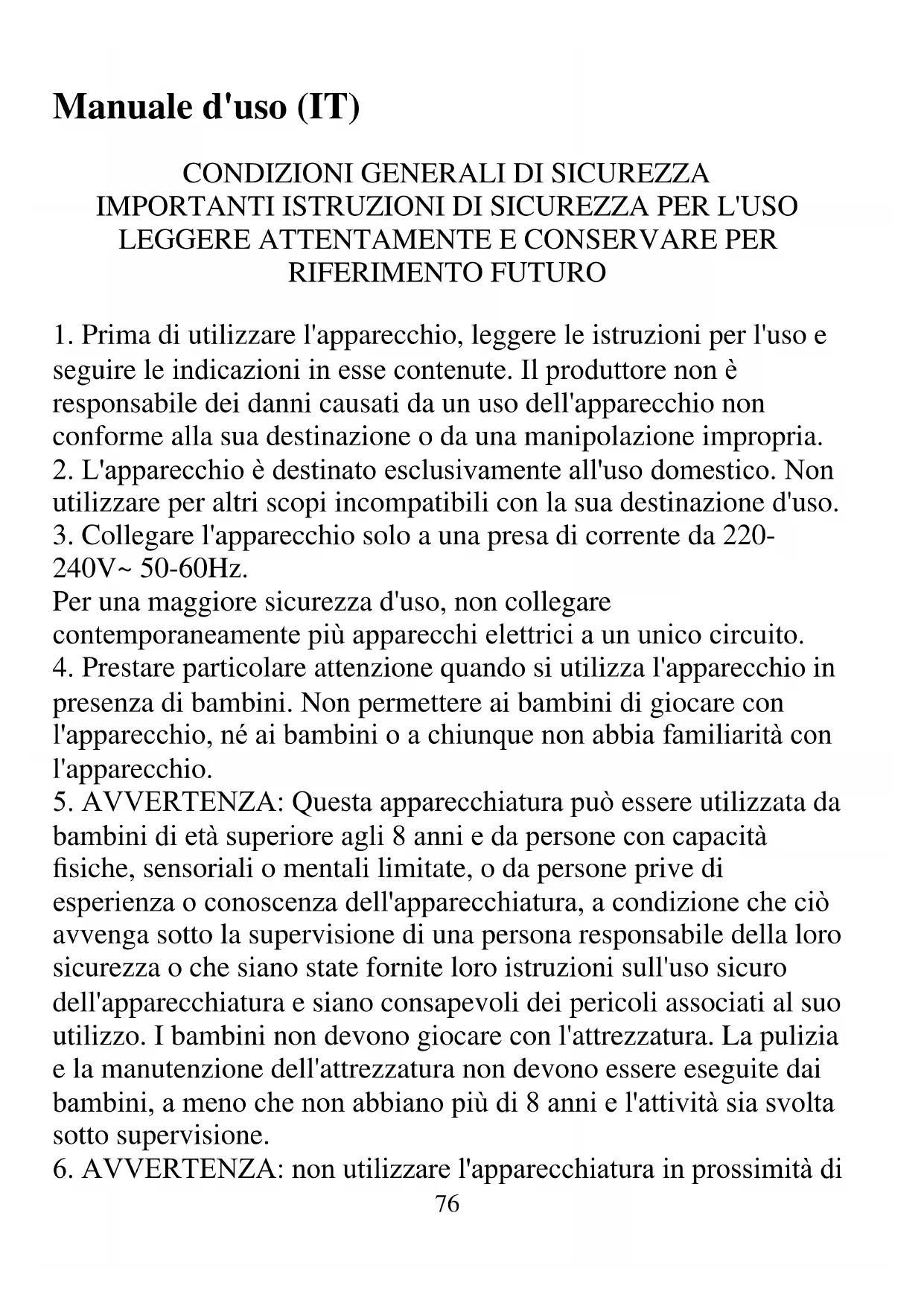 6. AVVERTENZA: non utilizzare l'apparecchiatura in prossimità di77