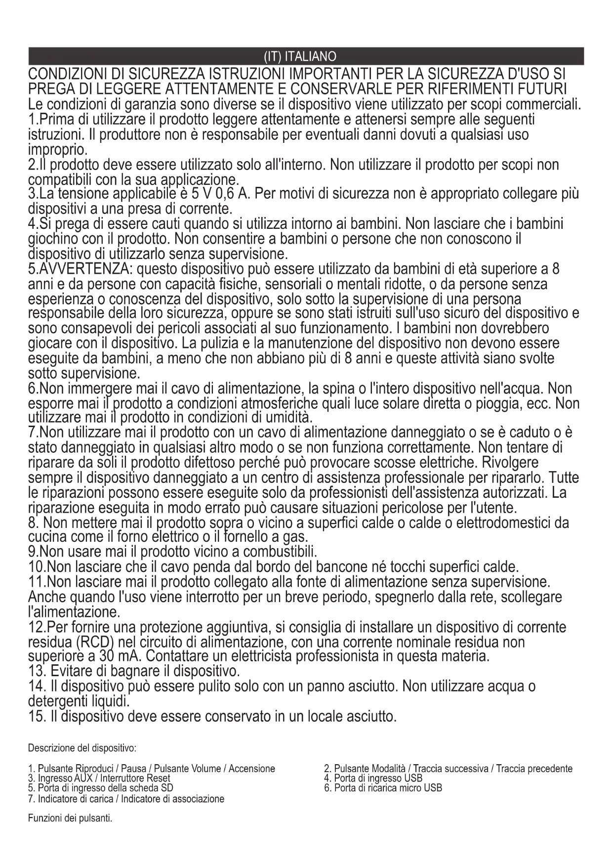 Na indikátore má zariadenie dve farby ikon Blikanie modrého svetla ukazuje, že zariadenie sa páruje Modré svetlo je stabilné a svieti. Zariadenie je pripojené k inému zariadeniu cez Bluetooth. Červené stabilné svetlo. Zariadenie sa nabíja. Riešenie problémov: Problém: Zariadenie sa nepripojuje cez Bluetooth, zariadenie sa nezobrazuje v zozname. Riešenie: Skontrolujte, či je zariadenie AD 1185 nastavené v režime Bluetooth a či nie je pripojené k inému zariadeniu. Skontrolujte zadnú časť zariadenia AD 1185, ak bliká kontrolné svetlo (7) alebo má modrú farbu. Ak je stabilný. Zariadenie je pripojené k inému zariadeniu. Ak bliká a vyhľadáva, skontrolujte, či je váš telefón / počítač / zariadenie kompatibilný s Bluetooth verzie 4.0. Problém: Zariadenie sa nespúšťa v režime USB / SD. Riešenie: Skontrolujte, či zariadenie USB pracuje na inej čítačke USB. Ak áno, skontrolujte, či je formát súboru nastavený na FAT 32. Ak nie, preformátujte zariadenie USB / SD na formát FAT32. Ak zariadenie stále nečíta, skontrolujte, či sú súbory na USB / SD vo formáte Mp3. Technická špecifikácia: Výstupný výkon: 6W Vstupný výkon: DC 5V 0,6A Verzia Bluetooth: 4.0. Podpora súborov: Mp3 Batéria: 1800 mAh 3,7 V Typ batérie: Lithium. Reproduktor: 2x5W Maximálny výkon: 20 W FM: 87,5 - 108 MHz Vyhlásenie CE nájdete: https://adler.com.pl/dane/CE/ADLER/ad_1185.pdf Starostlivosť o životné prostredie. Kartónový obal odovzdajte do zberných surovín. Polyetylénové vrecká (PE) vyhoďte do kontajnera na plast. Opotrebený spotrebič odovzdajte na príslušný zberný dvor, nebezpečné látky spotrebiča môžu predstavovať riziko pre životné prostredie. Elektrospotrebič odstráňte tak, aby nedochádzalo j jeho ďalšiemu použitiu. Ak sa v spotrebiči nachádzajú batérie, vyberte ich a odovzdajte ich na zberné miesto osobitne. Spotrebič nevyhadzujte do kontajnera na komunálny odpad!(IT) ITALIANO CONDIZIONI DI SICUREZZA ISTRUZIONI IMPORTANTI PER LA SICUREZZA D'USO SI PREGA DI LEGGERE ATTENTAMENTE E CONSERVARLE PER RIFERIMENTI FUTURI Le condizioni di garanzia sono diverse se il dispositivo viene utilizzato per scopi commerciali. 1.Prima di utilizzare il prodotto leggere attentamente e attenersi sempre alle seguenti istruzioni. Il produttore non è responsabile per eventuali danni dovuti a qualsiasi uso improprio. 2.Il prodotto deve essere utilizzato solo all'interno. Non utilizzare il prodotto per scopi non compatibili con la sua applicazione. 3.La tensione applicabile è 5 V 0,6 A. Per motivi di sicurezza non è appropriato collegare più dispositivi a una presa di corrente. 4.Si prega di essere cauti quando si utilizza intorno ai bambini. Non lasciare che i bambini giochino con il prodotto. Non consentire a bambini o persone che non conoscono il dispositivo di utilizzarlo senza supervisione. 5.AVVERTENZA: questo dispositivo può essere utilizzato da bambini di età superiore a 8 anni e da persone con capacità fisiche, sensoriali o mentali ridotte, o da persone senza esperienza o conoscenza del dispositivo, solo sotto la supervisione di una persona responsabile della loro sicurezza, oppure se sono stati istruiti sull'uso sicuro del dispositivo e sono consapevoli dei pericoli associati al suo funzionamento. I bambini non dovrebbero giocare con il dispositivo. La pulizia e la manutenzione del dispositivo non devono essere eseguite da bambini, a meno che non abbiano più di 8 anni e queste attività siano svolte sotto supervisione. 6.Non immergere mai il cavo di alimentazione, la spina o l'intero dispositivo nell'acqua. Non esporre mai il prodotto a condizioni atmosferiche quali luce solare diretta o pioggia, ecc. Non utilizzare mai il prodotto in condizioni di umidità. 7.Non utilizzare mai il prodotto con un cavo di alimentazione danneggiato o se è caduto o è stato danneggiato in qualsiasi altro modo o se non funziona correttamente. Non tentare di riparare da soli il prodotto difettoso perché può provocare scosse elettriche. Rivolgere sempre il dispositivo danneggiato a un centro di assistenza professionale per ripararlo. Tutte le riparazioni possono essere eseguite solo da professionisti dell'assistenza autorizzati. La riparazione eseguita in modo errato può causare situazioni pericolose per l'utente.