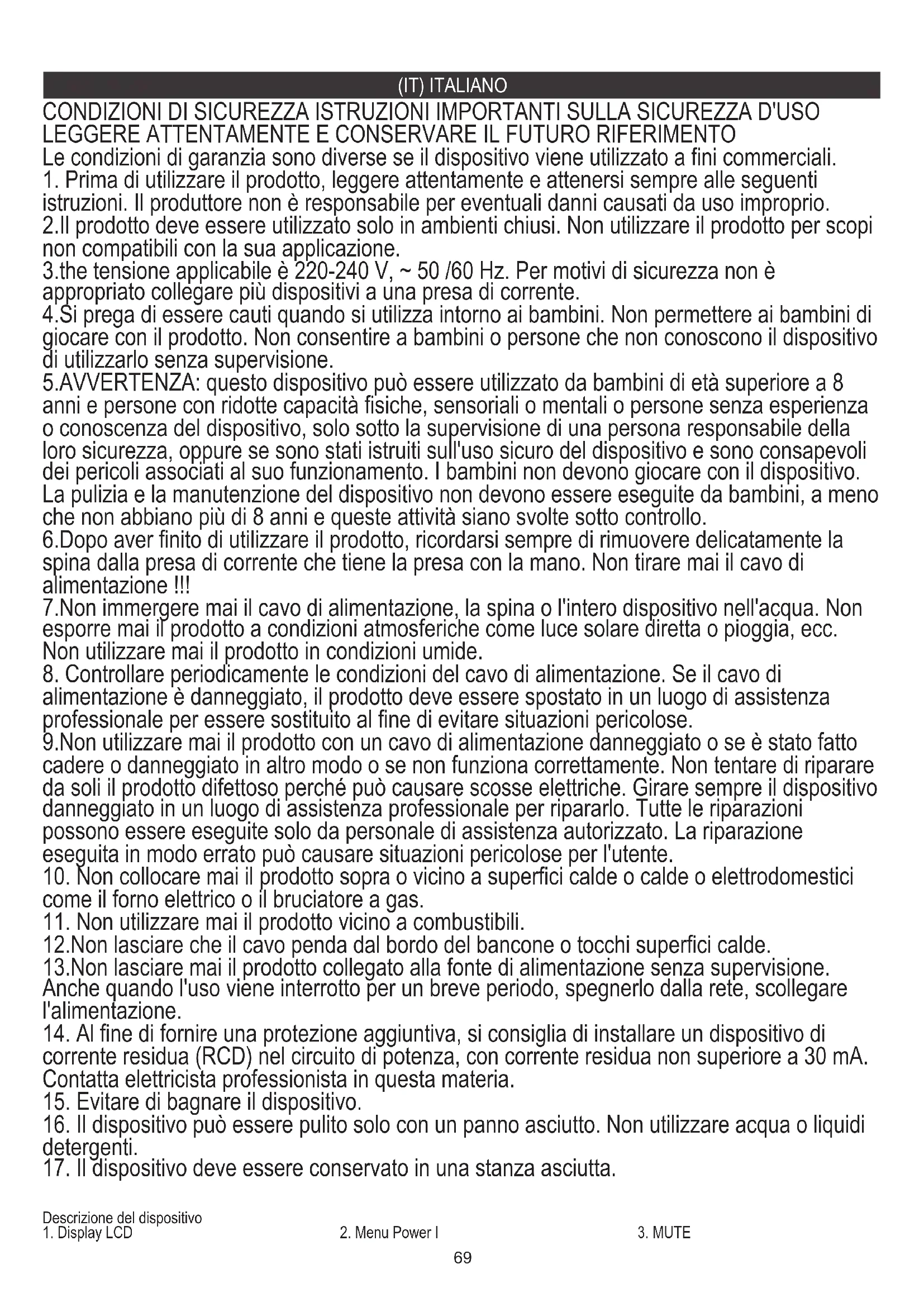 istruzioni. Il produttore non è responsabile per eventuali danni causati da uso improprio. 2.Il prodotto deve essere utilizzato solo in ambienti chiusi. Non utilizzare il prodotto per scopi non compatibili con la sua applicazione. 3.the tensione applicabile è 220-240 V, ~ 50 /60 Hz. Per motivi di sicurezza non è appropriato collegare più dispositivi a una presa di corrente. 4.Si prega di essere cauti quando si utilizza intorno ai bambini. Non permettere ai bambini di giocare con il prodotto. Non consentire a bambini o persone che non conoscono il dispositivo di utilizzarlo senza supervisione. 5.AVVERTENZA: questo dispositivo può essere utilizzato da bambini di età superiore a 8 anni e persone con ridotte capacità fisiche, sensoriali o mentali o persone senza esperienza o conoscenza del dispositivo, solo sotto la supervisione di una persona responsabile della loro sicurezza, oppure se sono stati istruiti sull'uso sicuro del dispositivo e sono consapevoli dei pericoli associati al suo funzionamento. I bambini non devono giocare con il dispositivo. La pulizia e la manutenzione del dispositivo non devono essere eseguite da bambini, a meno che non abbiano più di 8 anni e queste attività siano svolte sotto controllo. 6.Dopo aver finito di utilizzare il prodotto, ricordarsi sempre di rimuovere delicatamente la spina dalla presa di corrente che tiene la presa con la mano. Non tirare mai il cavo di alimentazione !!! 7.Non immergere mai il cavo di alimentazione, la spina o l'intero dispositivo nell'acqua. Non esporre mai il prodotto a condizioni atmosferiche come luce solare diretta o pioggia, ecc. Non utilizzare mai il prodotto in condizioni umide.