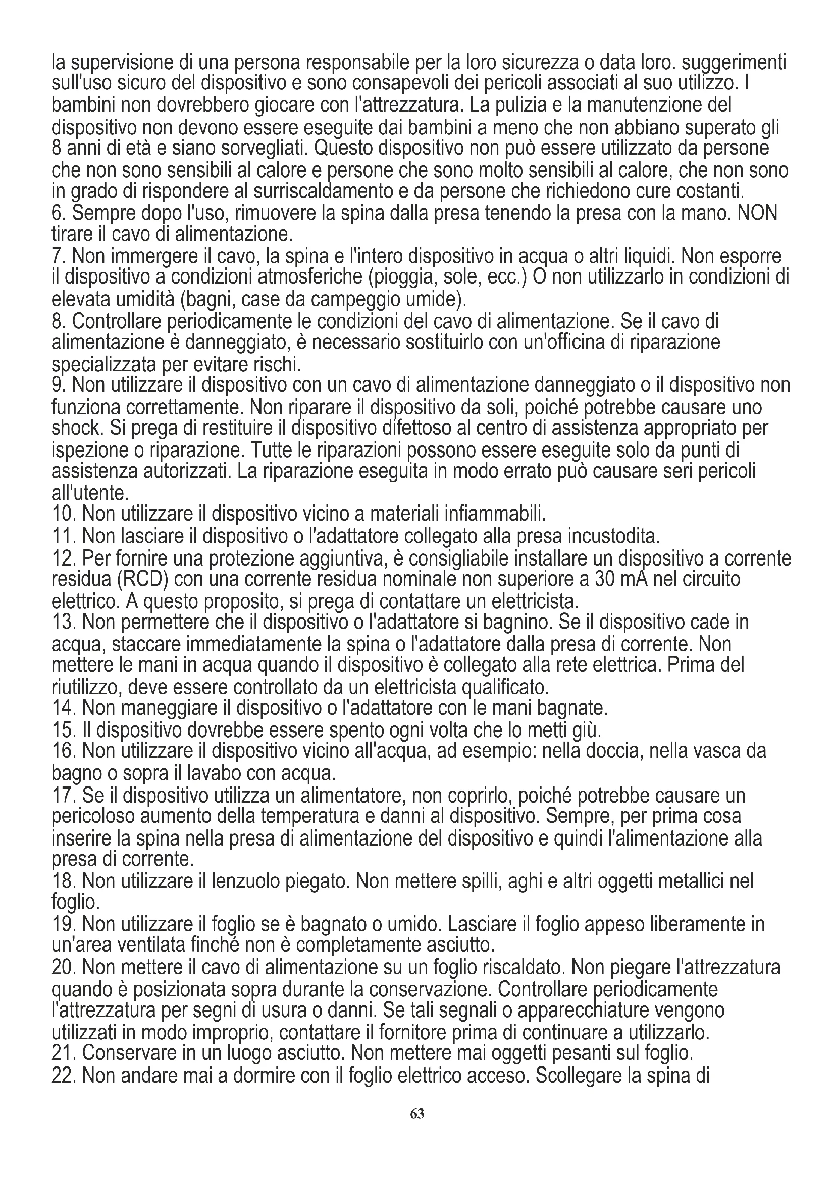 22. Non andare mai a dormire con il foglio elettrico acceso. Scollegare la spina di