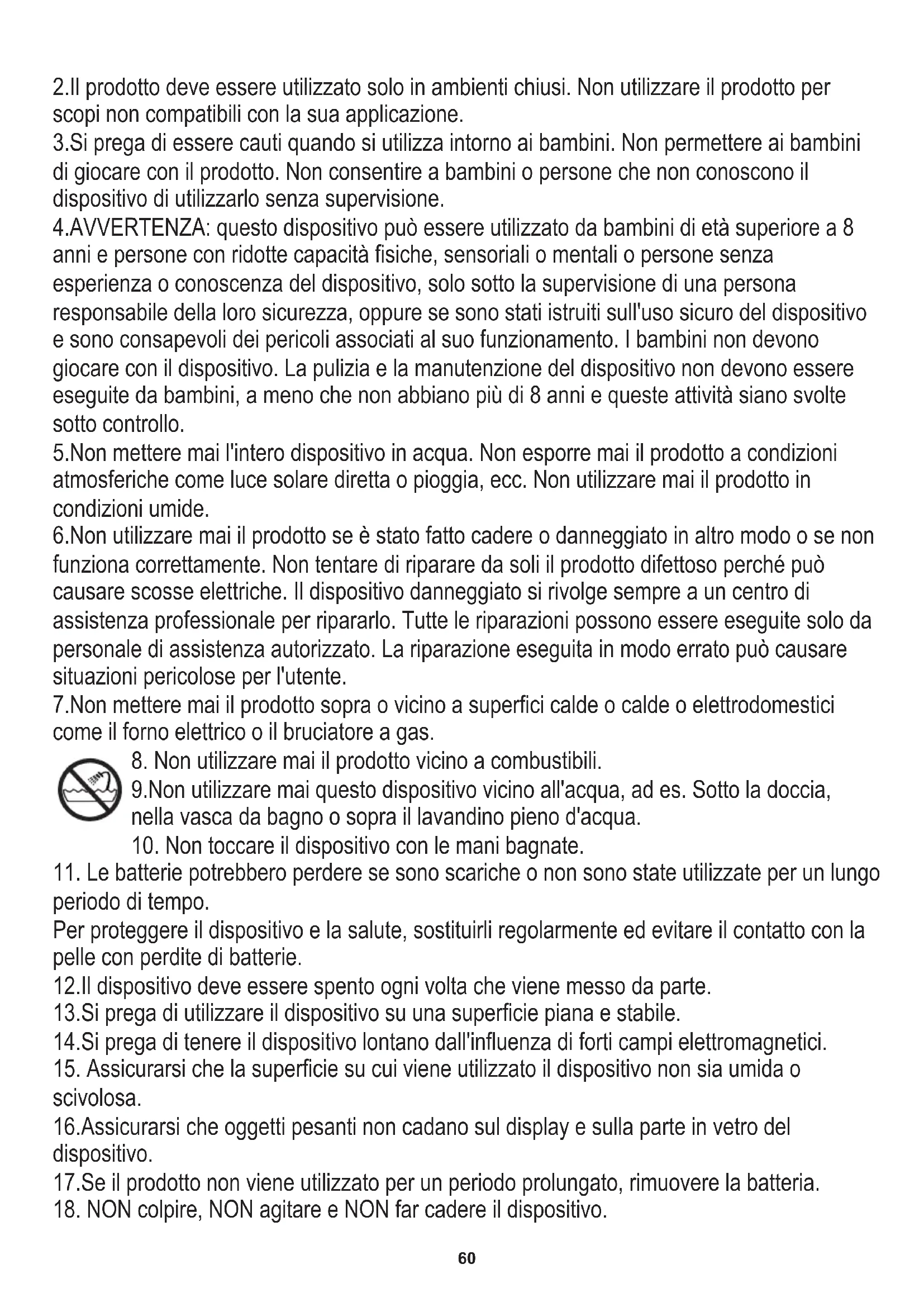 Per proteggere il dispositivo e la salute, sostituirli regolarmente ed evitare il contatto con la pelle con perdite di batterie. 3.Si prega di essere cauti quando si utilizza intorno ai bambini. Non permettere ai bambini di giocare con il prodotto. Non consentire a bambini o persone che non conoscono il dispositivo di utilizzarlo senza supervisione. 4.AVVERTENZA: questo dispositivo può essere utilizzato da bambini di età superiore a 8 anni e persone con ridotte capacità fisiche, sensoriali o mentali o persone senza esperienza o conoscenza del dispositivo, solo sotto la supervisione di una persona responsabile della loro sicurezza, oppure se sono stati istruiti sull'uso sicuro del dispositivo e sono consapevoli dei pericoli associati al suo funzionamento. I bambini non devono giocare con il dispositivo. La pulizia e la manutenzione del dispositivo non devono essere eseguite da bambini, a meno che non abbiano più di 8 anni e queste attività siano svolte sotto controllo. 5.Non mettere mai l'intero dispositivo in acqua. Non esporre mai il prodotto a condizioni atmosferiche come luce solare diretta o pioggia, ecc. Non utilizzare mai il prodotto in condizioni umide. 6.Non utilizzare mai il prodotto se è stato fatto cadere o danneggiato in altro modo o se non funziona correttamente. Non tentare di riparare da soli il prodotto difettoso perché può causare scosse elettriche. Il dispositivo danneggiato si rivolge sempre a un centro di assistenza professionale per ripararlo. Tutte le riparazioni possono essere eseguite solo da personale di assistenza autorizzato. La riparazione eseguita in modo errato può causare situazioni pericolose per l'utente. 7.Non mettere mai il prodotto sopra o vicino a superfici calde o calde o elettrodomestici come il forno elettrico o il bruciatore a gas.