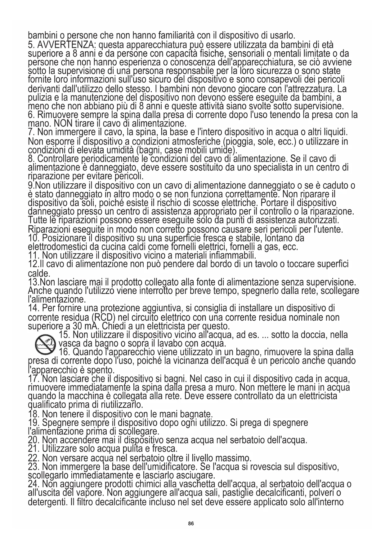 15. Non utilizzare il dispositivo vicino all'acqua, ad es. ... sotto la doccia, nella