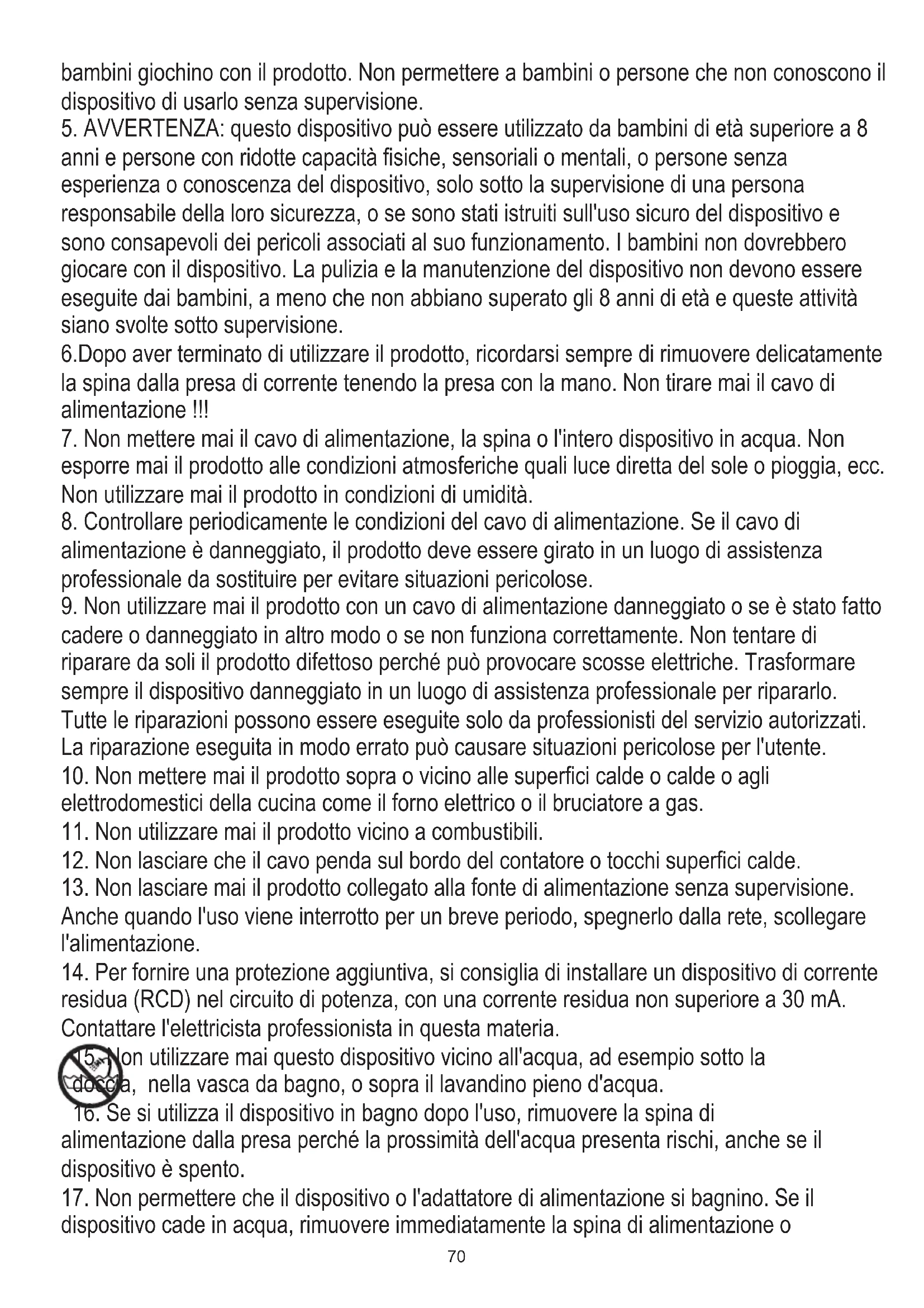 7. Non mettere mai il cavo di alimentazione, la spina o l'intero dispositivo in acqua. Non