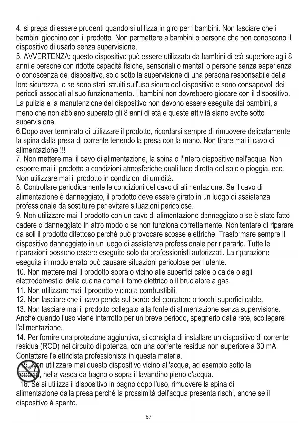anni e persone con ridotte capacità fisiche, sensoriali o mentali o persone senza esperienza o conoscenza del dispositivo, solo sotto la supervisione di una persona responsabile della loro sicurezza, o se sono stati istruiti sull'uso sicuro del dispositivo e sono consapevoli dei pericoli associati al suo funzionamento. I bambini non dovrebbero giocare con il dispositivo. La pulizia e la manutenzione del dispositivo non devono essere eseguite dai bambini, a meno che non abbiano superato gli 8 anni di età e queste attività siano svolte sotto supervisione. 6.Dopo aver terminato di utilizzare il prodotto, ricordarsi sempre di rimuovere delicatamente la spina dalla presa di corrente tenendo la presa con la mano. Non tirare mai il cavo di alimentazione !!!
