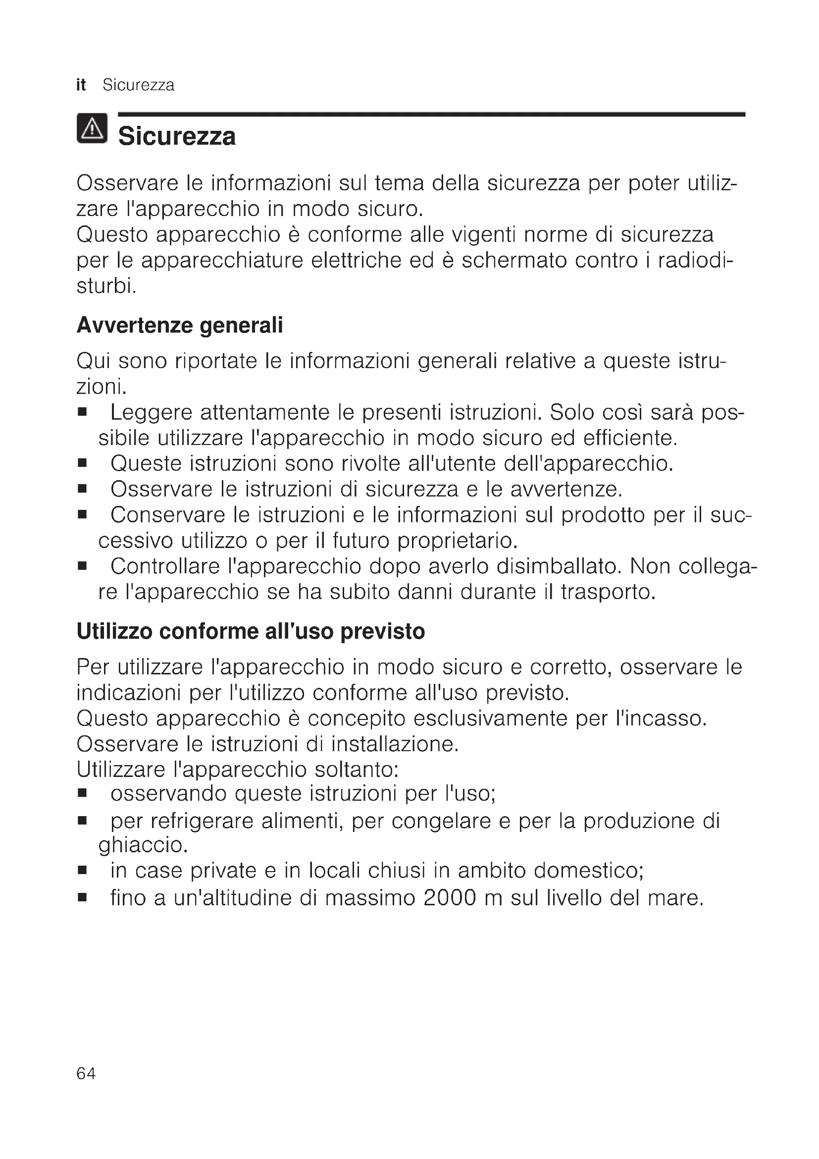 Sicurezza Osservare le informazioni sul tema della sicurezza per poter utiliz- zare l'apparecchio in modo sicuro. Questo apparecchio èconforme alle vigenti norme disicurezza per leapparecchiature elettriche ed èschermato contro iradiodi- sturbi. Avvertenze generali Qui sono riportate le informazioni generali relative a queste istru- zioni. ¡ Leggere attentamente le presenti istruzioni. Solo così sarà pos- sibile utilizzare l'apparecchio in modo sicuro ed efficiente. ¡ Queste istruzioni sono rivolte all'utente dell'apparecchio. ¡ Osservare le istruzioni di sicurezza e le avvertenze. ¡ Conservare le istruzioni e le informazioni sul prodotto per il suc- cessivo utilizzo o per il futuro proprietario. ¡ Controllare l'apparecchio dopo averlo disimballato. Non collega- re l'apparecchio se ha subito danni durante il trasporto. Utilizzo conforme all'uso previsto Per utilizzare l'apparecchio in modo sicuro e corretto, osservare le indicazioni per l'utilizzo conforme all'uso previsto. Questo apparecchio è concepito esclusivamente per l'incasso. Osservare le istruzioni di installazione. Utilizzare l'apparecchio soltanto: ¡ osservando queste istruzioni per l'uso; ¡ per refrigerare alimenti, per congelare e per la produzione di ghiaccio. ¡ in case private e in locali chiusi in ambito domestico; ¡ fino a un'altitudine di massimo 2000m sul livello del mare.Sicurezza it