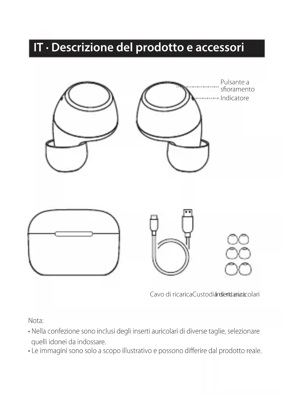 - Le immagini sono solo a scopo illustrativo e possono differire dal prodotto reale. Cavo di ricaricaCustodia di ricarica Inserti auricolari Indicatore Pulsante a sfioramento● Caricare gli auricolari Avvertenza: Le batterie ricaricabili che alimentano questo prodotto devono essere smaltite in modo appropriato per un corretto riciclaggio. Non smaltire le batterie nel fuoco al fine di prevenire esplosioni. ■ Manuale utente