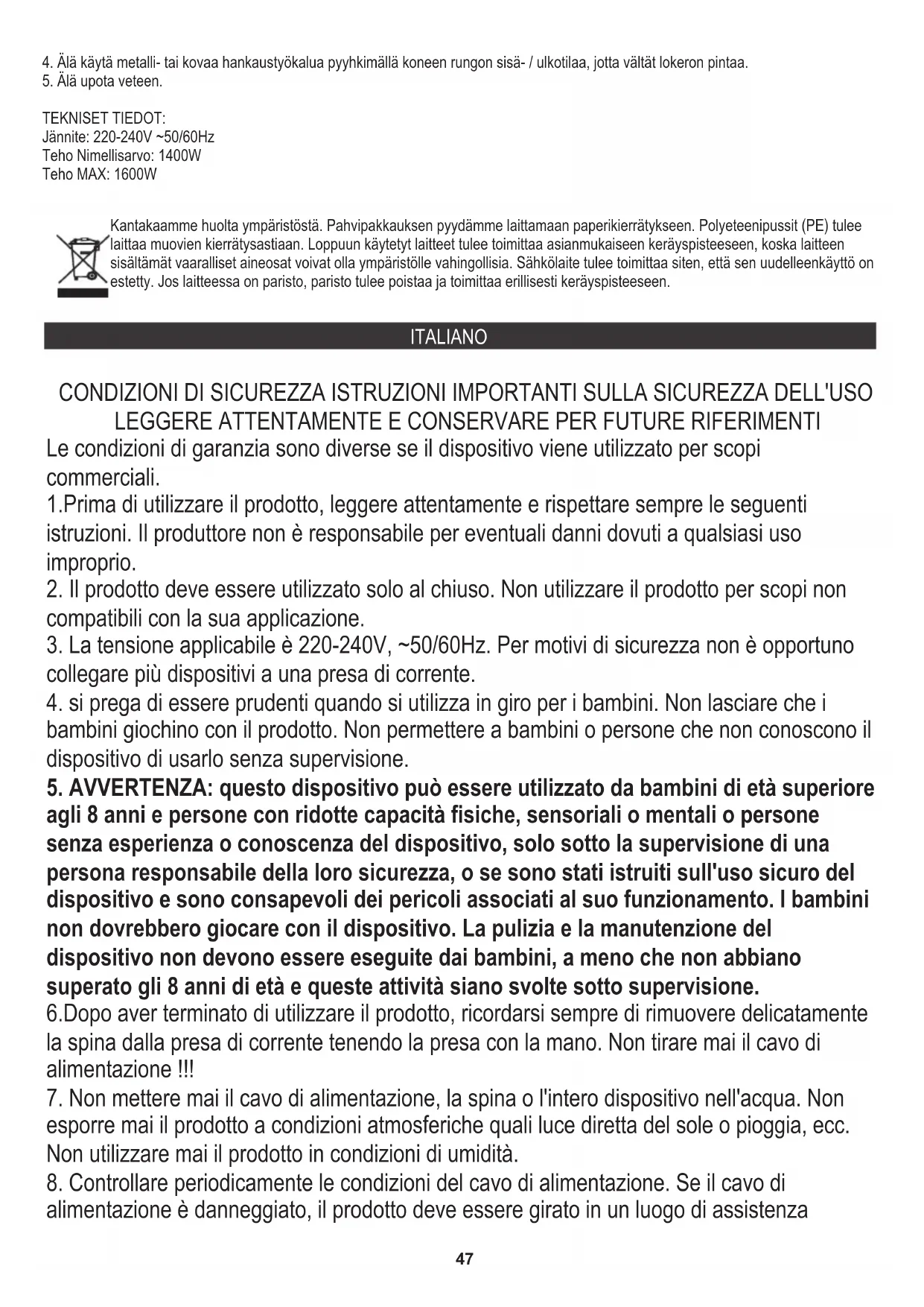 bambini giochino con il prodotto. Non permettere a bambini o persone che non conoscono il dispositivo di usarlo senza supervisione. 1.Prima di utilizzare il prodotto, leggere attentamente e rispettare sempre le seguenti istruzioni. Il produttore non è responsabile per eventuali danni dovuti a qualsiasi uso improprio. CONDIZIONI DI SICUREZZA ISTRUZIONI IMPORTANTI SULLA SICUREZZA DELL'USO LEGGERE ATTENTAMENTE E CONSERVARE PER FUTURE RIFERIMENTI