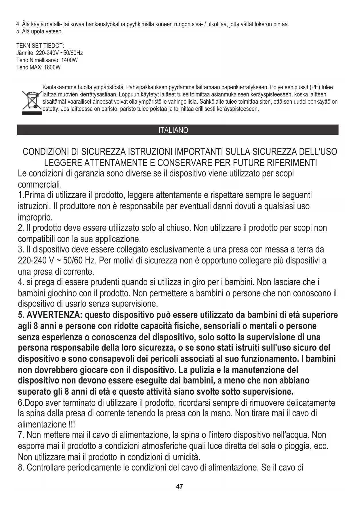 Tensione: 220-240V ~50/60Hz Potenza MAX: 1600W DATI TECNICI: Potenza nom .: 1400 W Gli imballi di cartone devono essere smaltiti nel contenitore per la carta. I sacchetti di polietilene (PE) vanno gettati nel contenitore per la plastica. L'apparecchio usato deve essere rottamato presso un centro di raccolta autorizzato, poiché contiene elementi pericolosi che potrebbero costituire una minaccia per l'ambiente. I dispositivi elettrici devono essere resi al fine di evitare il loro riutilizzo. Se il dispositivo contiene una batteria, deve essere rimossa e smaltita separatamente in un punto di raccolta. Prendersi cura dell'ambiente Non gettare l'apparecchio nei contenitori dei rifiuti urbani!