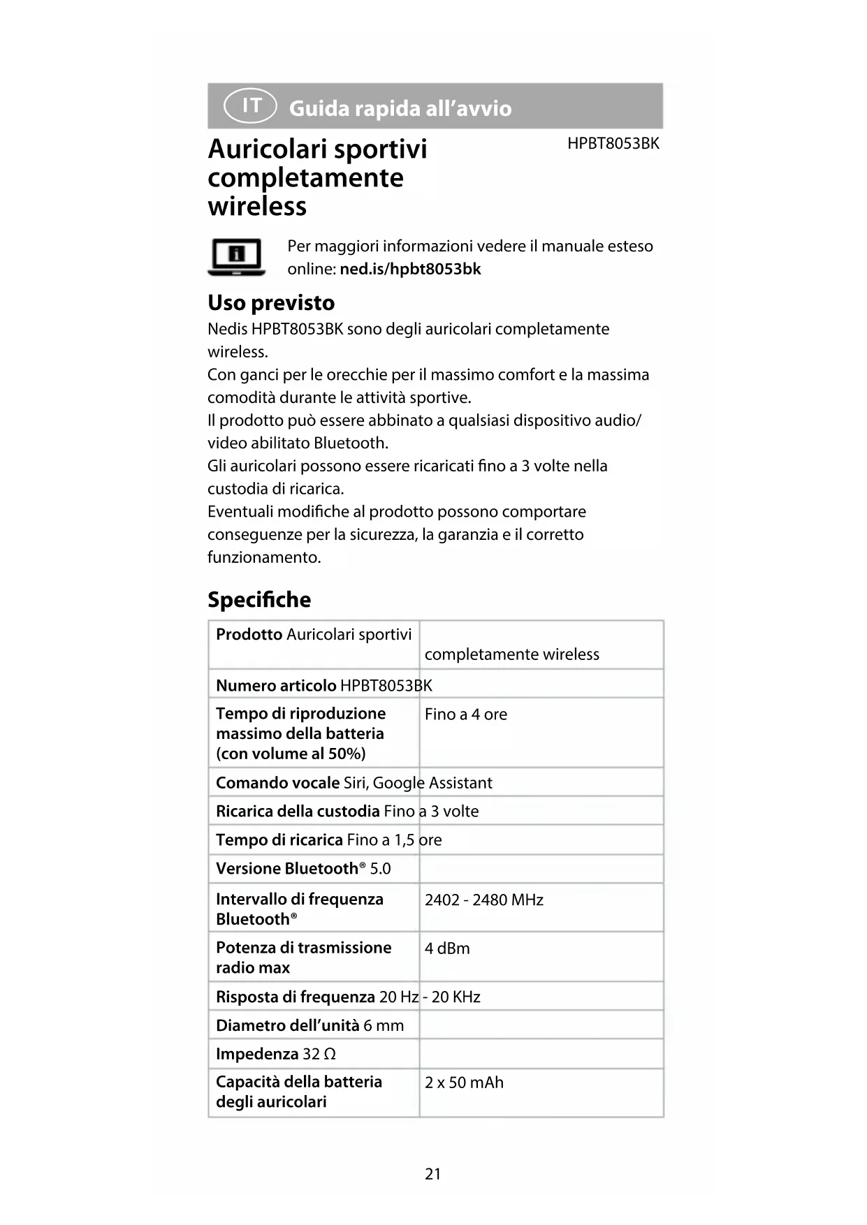 Guida rapida all’avvio Auricolari sportivi completamente wireless HPBT8053BK Per maggiori informazioni vedere il manuale esteso online: ned.is/hpbt8053bk Uso previsto Nedis HPBT8053BK sono degli auricolari completamente wireless. Con ganci per le orecchie per il massimo comfort e la massima comodità durante le attività sportive. Il prodotto può essere abbinato a qualsiasi dispositivo audio/ video abilitato Bluetooth. Gli auricolari possono essere ricaricati no a 3 volte nella custodia di ricarica. Eventuali modiche al prodotto possono comportare conseguenze per la sicurezza, la garanzia e il corretto funzionamento. Speciche Prodotto Auricolari sportivi completamente wireless Numero articolo HPBT8053BK Tempo di riproduzione massimo della batteria (con volume al 50%) Fino a 4 ore Comando vocale Siri, Google Assistant Ricarica della custodia Fino a 3 volte Tempo di ricarica Fino a 1,5 ore Versione Bluetooth® 5.0 Intervallo di frequenza Bluetooth® 2402 - 2480 MHz Potenza di trasmissione radio max 4 dBm Risposta di frequenza 20 Hz - 20 KHz Diametro dell’unità 6 mm Impedenza 32 Ω Capacità della batteria degli auricolari 2 x 50 mAh22 Capacità della batteria della custodia di ricarica 300 mAh Collegamento USB tipo C™ Ingresso di alimentazione 5.0 VDC ; 300 mA Grado di protezione No Parti principali (immagine A) 1 Alloggiamento auricolare sinistro 2 Alloggiamento auricolare destro 3 Spia LED della custodia di ricarica 4 Porta di ricarica USB Type-C™ 5 Pulsante auricolare sinistro 6 Pulsante auricolare destro 7 Microfono 8 Spia LED di ricarica 9 Spia LED di collegamento q Cavo da USB a USB Tipo