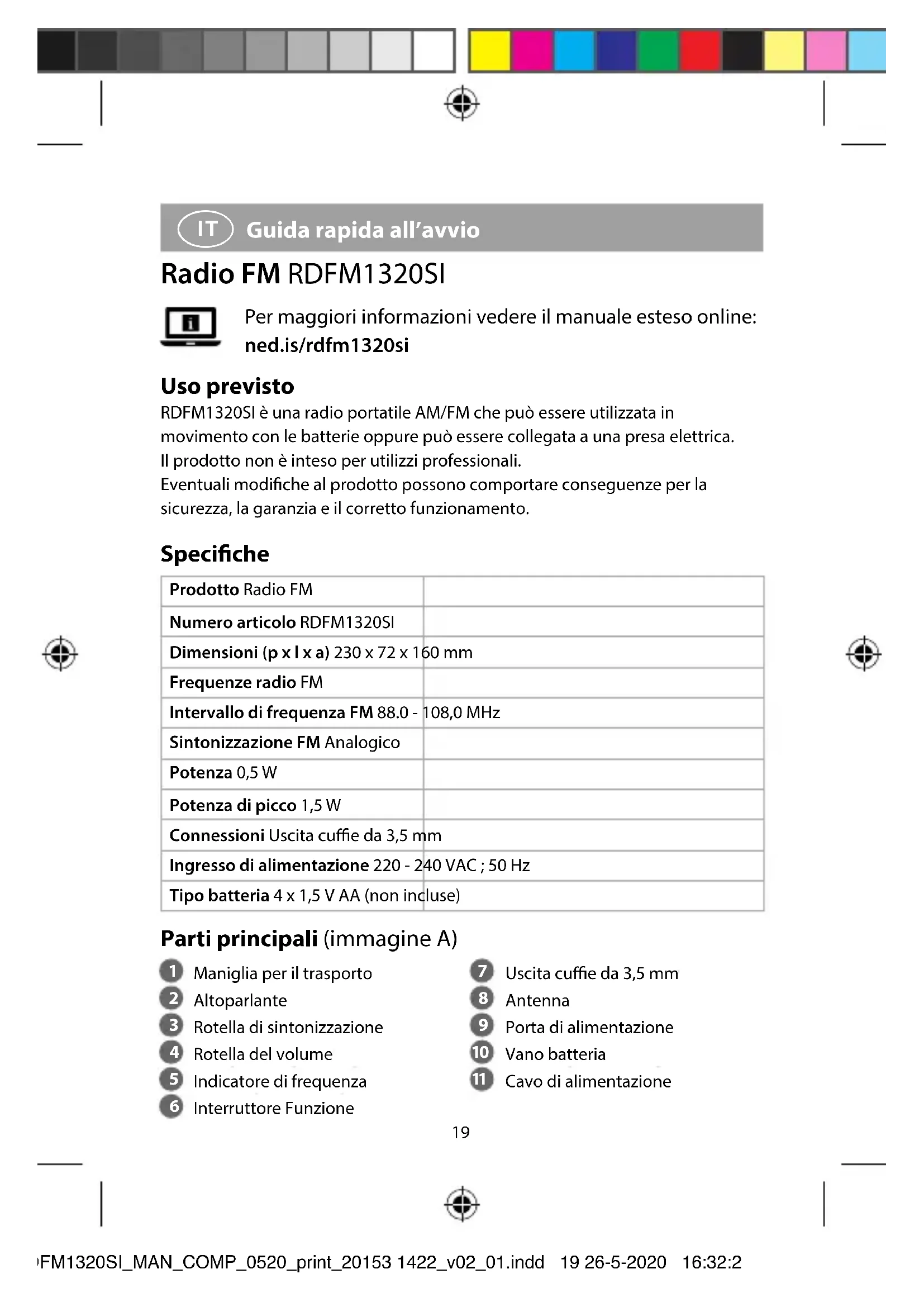 Guida rapida all’avvio Radio FM RDFM1320SI Per maggiori informazioni vedere il manuale esteso online: ned.is/rdfm1320si Uso previsto RDFM1320SI è una radio portatile AM/FM che può essere utilizzata in movimento con le batterie oppure può essere collegata a una presa elettrica. Il prodotto non è inteso per utilizzi professionali. Eventuali modiche al prodotto possono comportare conseguenze per la sicurezza, la garanzia e il corretto funzionamento. Speciche Prodotto Radio FM Numero articolo RDFM1320SI Dimensioni (p x l x a) 230 x 72 x 160 mm Frequenze radio FM Intervallo di frequenza FM 88.0 - 108,0 MHz Sintonizzazione FM Analogico Potenza 0,5 W Potenza di picco 1,5 W Connessioni Uscita cue da 3,5 mm Ingresso di alimentazione 220 - 240 VAC ; 50 Hz Tipo batteria 4 x 1,5 V AA (non incluse) Parti principali (immagine A)