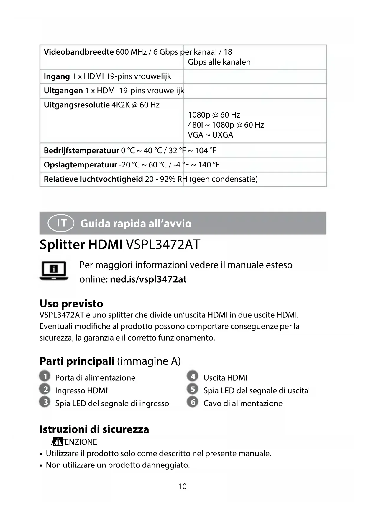 Guida rapida all’avvio Splitter HDMI VSPL3472AT Per maggiori informazioni vedere il manuale esteso online: ned.is/vspl3472at Uso previsto VSPL3472AT è uno splitter che divide un’uscita HDMI in due uscite HDMI.Eventuali modiche al prodotto possono comportare conseguenze per la sicurezza, la garanzia e il corretto funzionamento. Parti principali (immagine A)