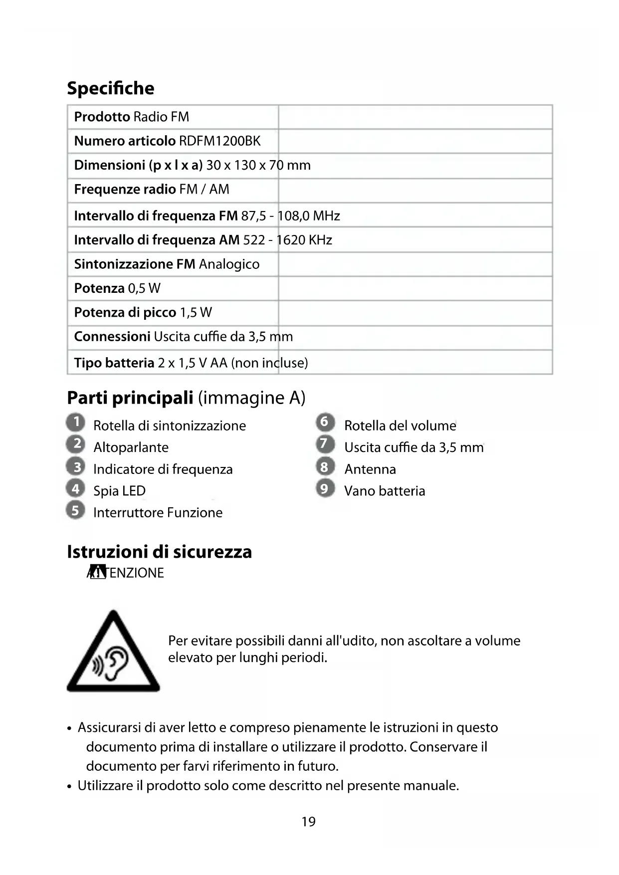 Guida rapida all’avvio Radio FM RDFM1200BK Per maggiori informazioni vedere il manuale esteso online: ned.is/rdfm1200bk Uso previsto RDFM1200BK è una radio portatile AM/FM che può essere utilizzata in movimento con le batterie oppure può essere collegata a una presa elettrica.Il prodotto non è inteso per utilizzi professionali.Eventuali modiche al prodotto possono comportare conseguenze per la sicurezza, la garanzia e il corretto funzionamento.19 Speciche Prodotto Radio FM Numero articolo RDFM1200BK Dimensioni (p x l x a) 30 x 130 x 70 mm Frequenze radio FM / AM Intervallo di frequenza FM 87,5 - 108,0 MHz Intervallo di frequenza AM 522 - 1620 KHz Sintonizzazione FM Analogico Potenza 0,5 W Potenza di picco 1,5 W Connessioni Uscita cue da 3,5 mm Tipo batteria 2 x 1,5 V AA (non incluse) Parti principali (immagine A)
