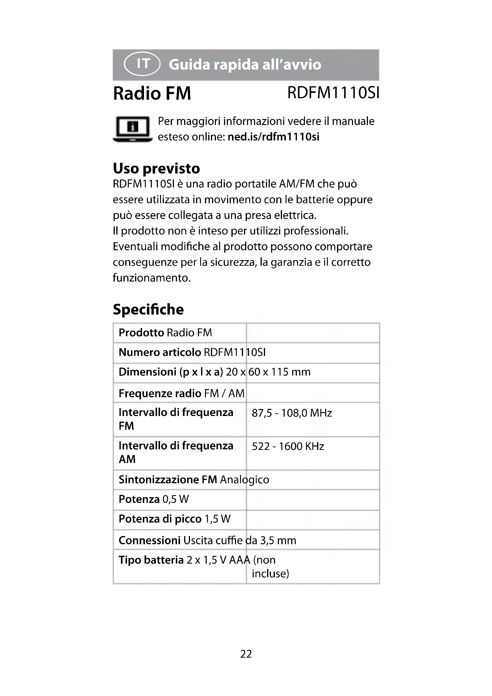 Guida rapida all’avvio Radio FM RDFM1110SI Per maggiori informazioni vedere il manuale esteso online: ned.is/rdfm1110si Uso previsto RDFM1110SI è una radio portatile AM/FM che può essere utilizzata in movimento con le batterie oppure può essere collegata a una presa elettrica. Il prodotto non è inteso per utilizzi professionali. Eventuali modiche al prodotto possono comportare conseguenze per la sicurezza, la garanzia e il corretto funzionamento. Speciche Prodotto Radio FM Numero articolo RDFM1110SI Dimensioni (p x l x a) 20 x 60 x 115 mm Frequenze radio FM / AM Intervallo di frequenza