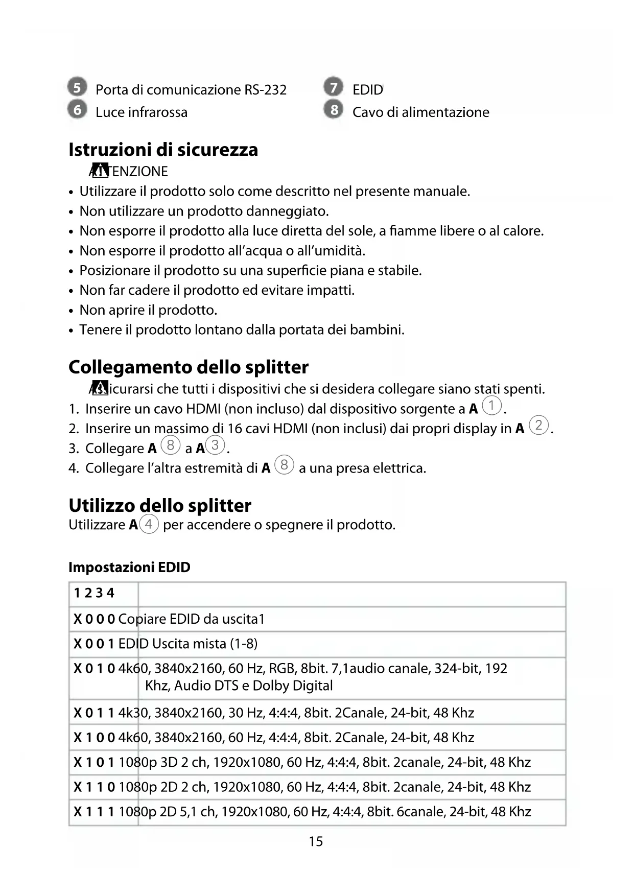 a una presa elettrica. Utilizzo dello splitter Utilizzare A4 per accendere o spegnere il prodotto. Impostazioni EDID