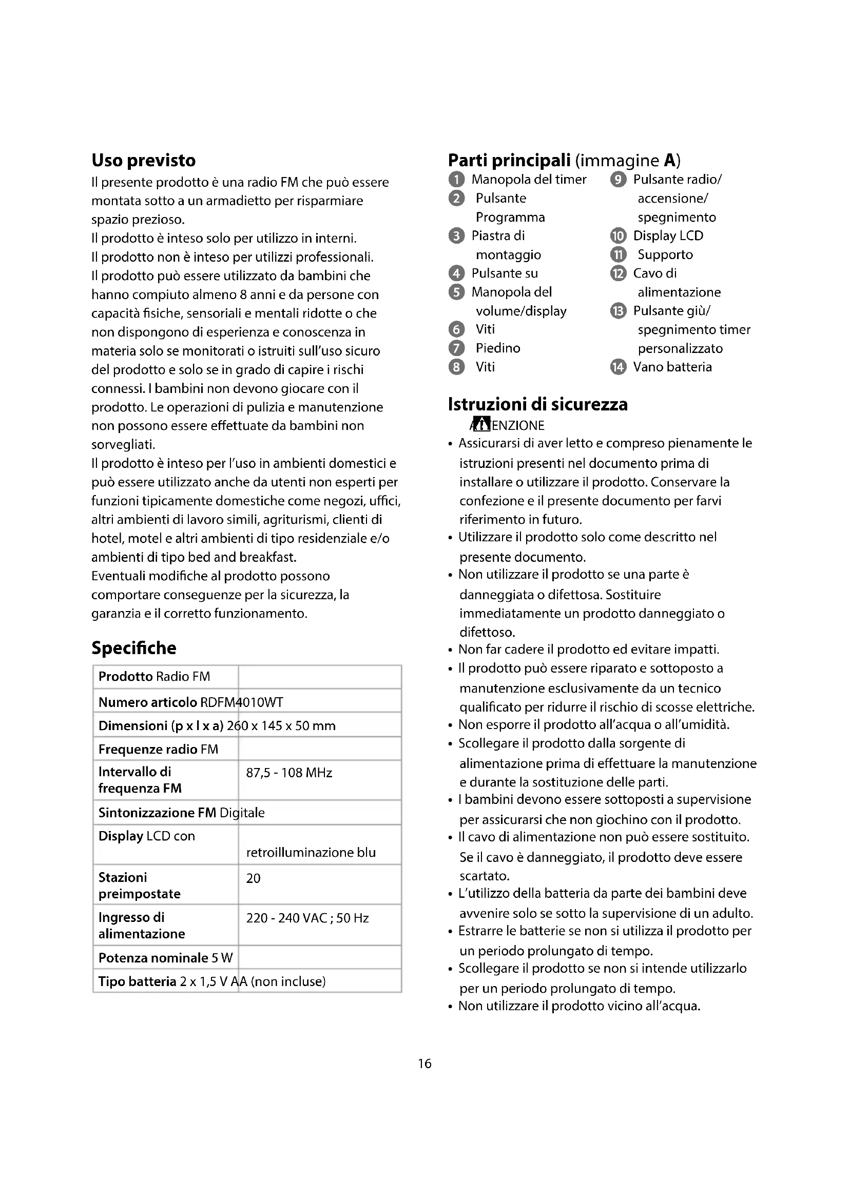 - Non utilizzare il prodotto vicino all’acqua. Uso previsto Il presente prodotto è una radio FM che può essere montata sotto a un armadietto per risparmiare spazio prezioso. Il prodotto è inteso solo per utilizzo in interni. Il prodotto non è inteso per utilizzi professionali. Il prodotto può essere utilizzato da bambini che hanno compiuto almeno 8 anni e da persone con capacità siche, sensoriali e mentali ridotte o che non dispongono di esperienza e conoscenza in materia solo se monitorati o istruiti sull’uso sicuro del prodotto e solo se in grado di capire i rischi connessi. I bambini non devono giocare con il prodotto. Le operazioni di pulizia e manutenzione non possono essere eettuate da bambini non sorvegliati. Il prodotto è inteso per l’uso in ambienti domestici e può essere utilizzato anche da utenti non esperti per funzioni tipicamente domestiche come negozi, uci, altri ambienti di lavoro simili, agriturismi, clienti di hotel, motel e altri ambienti di tipo residenziale e/o ambienti di tipo bed and breakfast. Eventuali modiche al prodotto possono comportare conseguenze per la sicurezza, la garanzia e il corretto funzionamento. Speciche Prodotto Radio FM Numero articolo RDFM4010WT Dimensioni (p x l x a) 260 x 145 x 50 mm Frequenze radio FM Intervallo di frequenza FM 87,5 - 108 MHz Sintonizzazione FM Digitale Display LCD con retroilluminazione blu Stazioni preimpostate