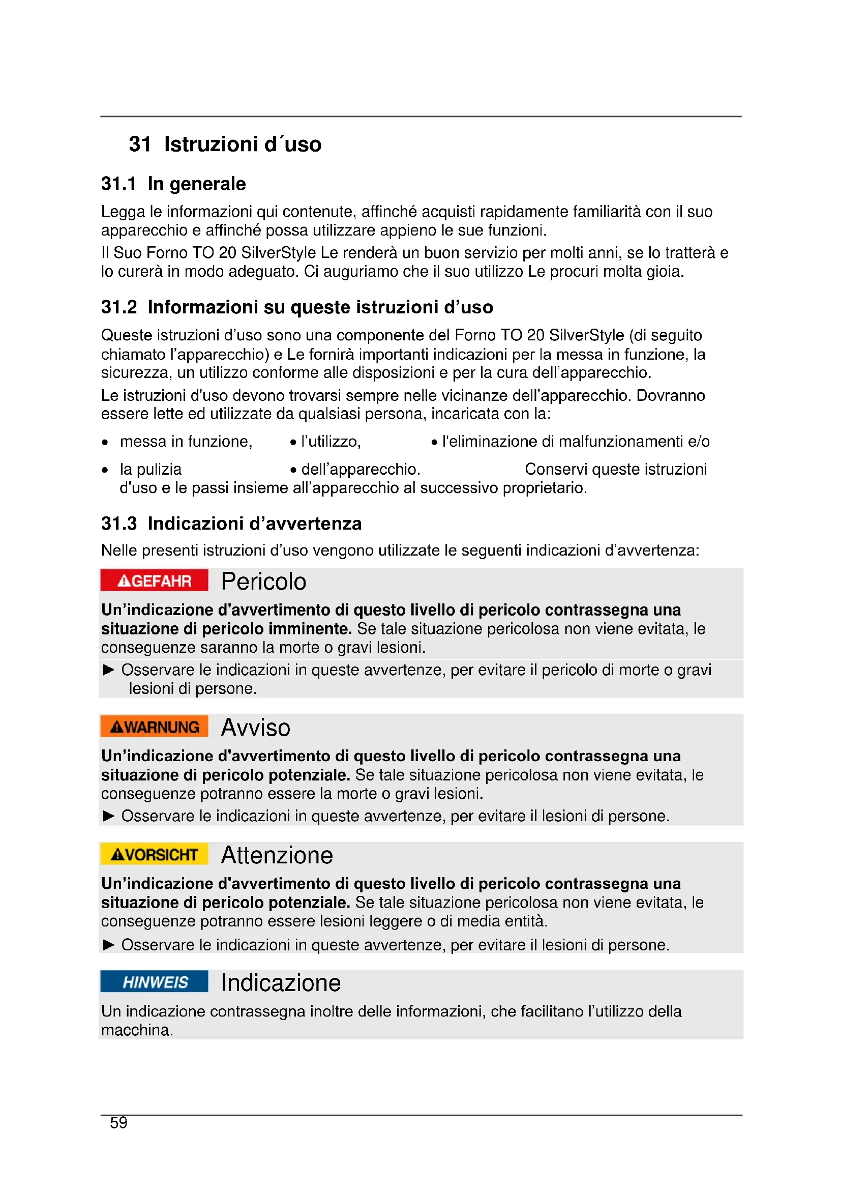 Nelle presenti istruzioni d’uso vengono utilizzate le seguenti indicazioni d’avvertenza: Pericolo Un’indicazione d'avvertimento di questo livello di pericolo contrassegna una situazione di pericolo imminente. Se tale situazione pericolosa non viene evitata, le conseguenze saranno la morte o gravi lesioni. ► Osservare le indicazioni in queste avvertenze, per evitare il pericolo di morte o gravi lesioni di persone. Avviso Un’indicazione d'avvertimento di questo livello di pericolo contrassegna una situazione di pericolo potenziale. Se tale situazione pericolosa non viene evitata, le conseguenze potranno essere la morte o gravi lesioni. ► Osservare le indicazioni in queste avvertenze, per evitare il lesioni di persone. Attenzione Un’indicazione d'avvertimento di questo livello di pericolo contrassegna una situazione di pericolo potenziale. Se tale situazione pericolosa non viene evitata, le conseguenze potranno essere lesioni leggere o di media entità. ► Osservare le indicazioni in queste avvertenze, per evitare il lesioni di persone. Indicazione Un indicazione contrassegna inoltre delle informazioni, che facilitano l’utilizzo della macchina.60