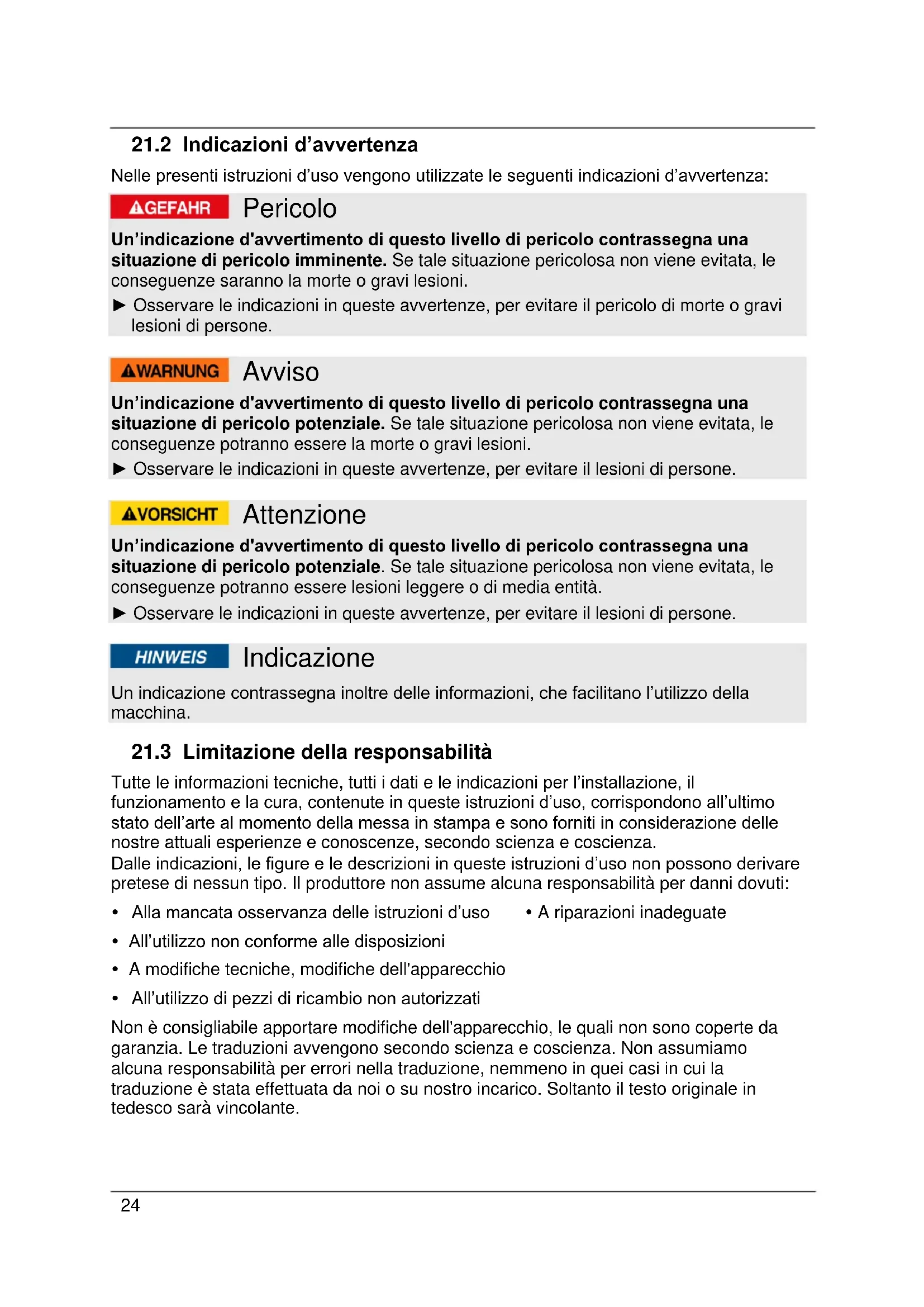 Nelle presenti istruzioni d’uso vengono utilizzate le seguenti indicazioni d’avvertenza: Pericolo Un’indicazione d'avvertimento di questo livello di pericolo contrassegna una situazione di pericolo imminente. Se tale situazione pericolosa non viene evitata, le conseguenze saranno la morte o gravi lesioni. ► Osservare le indicazioni in queste avvertenze, per evitare il pericolo di morte o gravi lesioni di persone. Avviso Un’indicazione d'avvertimento di questo livello di pericolo contrassegna una situazione di pericolo potenziale. Se tale situazione pericolosa non viene evitata, le conseguenze potranno essere la morte o gravi lesioni. ► Osservare le indicazioni in queste avvertenze, per evitare il lesioni di persone. Attenzione Un’indicazione d'avvertimento di questo livello di pericolo contrassegna una situazione di pericolo potenziale. Se tale situazione pericolosa non viene evitata, le conseguenze potranno essere lesioni leggere o di media entità. ► Osservare le indicazioni in queste avvertenze, per evitare il lesioni di persone. Indicazione Un indicazione contrassegna inoltre delle informazioni, che facilitano l’utilizzo della macchina.