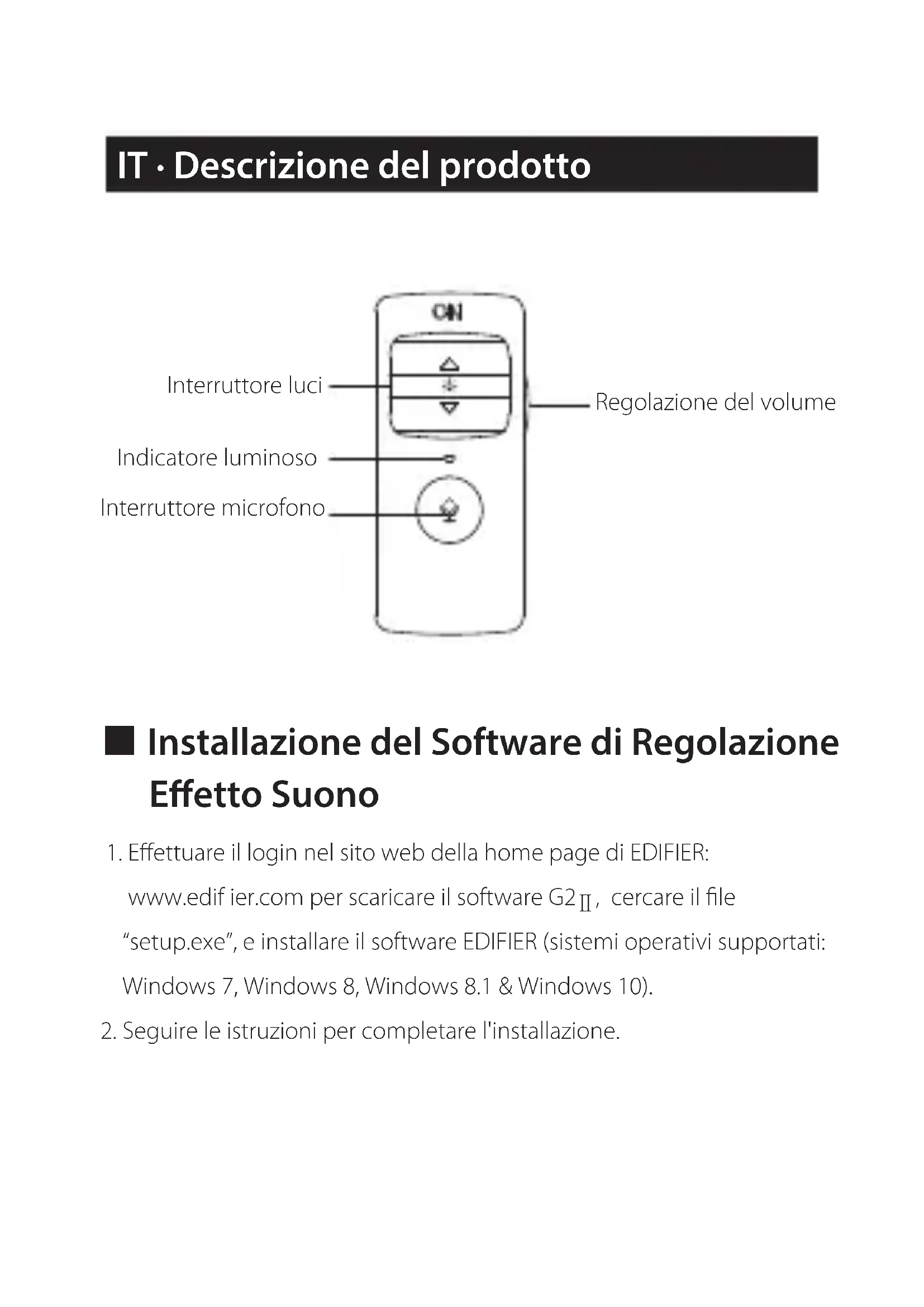 Scarica le istruzioni per il tuo Auricolare in formato PDF gratuitamente! Trova il tuo manuale G2 II - EDIFIER e riprendi in mano il tuo dispositivo elettronico. In questa pagina sono pubblicati tutti i documenti necessari per l'utilizzo del tuo dispositivo. G2 II del marchio EDIFIER.