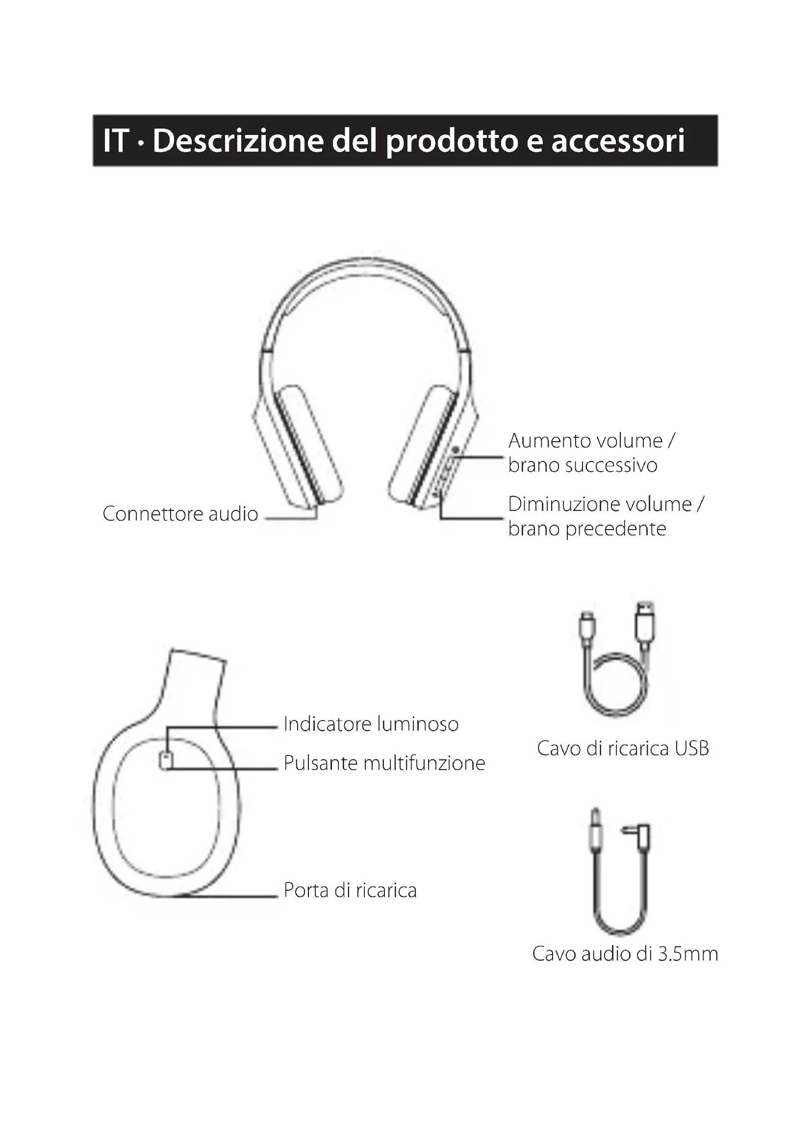 - Cancellare le impostazioni di accoppiamento: quando sono accese e non collegate, premere e tenere premuto contemporaneamente i pulsanti "+" e "-" per 5 secondi, attendere no a che la luce blu lampeggi velocemente, dopodiché le impostazioni di accoppiamento sono cancellate. Rispondere una chiamata: premere una sola volta Riagganciare la chiamata: premere una sola volta Riutare una chiamata: premere e tenere premuto Aumento volume: premere una sola volta Brano successivo: premere e tenere premuto Diminuzione volume: premere una sola volta Brano precedente: premere e tenere premuto Pausa/play: premere una sola volta Assistente vocale: doppia pressioneLa luce rossa lampeggia anziché quella blu.