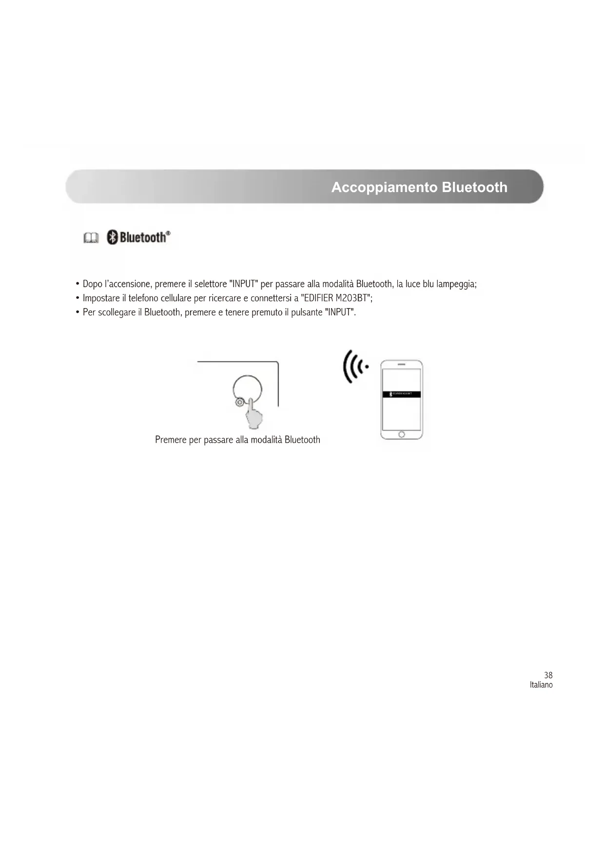 - Impostare il telefono cellulare per ricercare e connettersi a "EDIFIER M203BT";