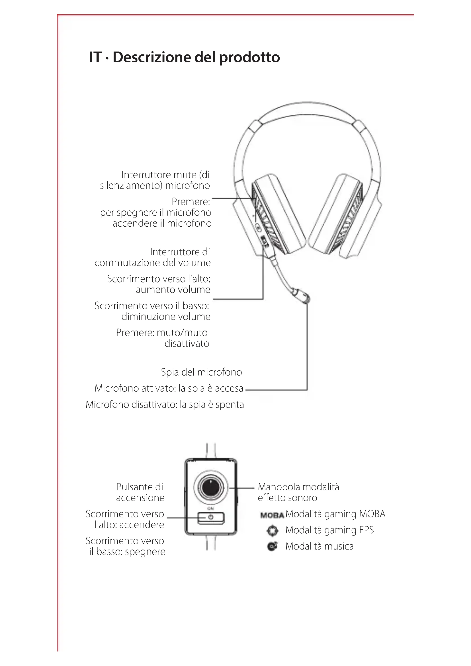 Interruttore di cancellazione rumore Premere: attiva/disattiva la cancellazione del rumore (non operativo se il software è disinstallato) Spia di cancellazione rumore Cancellazione rumore attivato: la spia è accesa Cancellazione rumore disattivato: la spia è spenta Spia effetto luminoso Premere: Interruttore dell'effetto luminoso Nota: Le immagini sono solo a scopo illustrativo e possono differire dal prodotto reale.• Conservare il prodotto al riparo da ambienti umidi per evitare di danneggiare la circuiteria interna. Non utilizzare il prodotto durante una attività fisica intensa o in presenza di abbondante sudorazione al fine di prevenire che il sudore penetri nel prodotto e ne causi il danneggiamento.