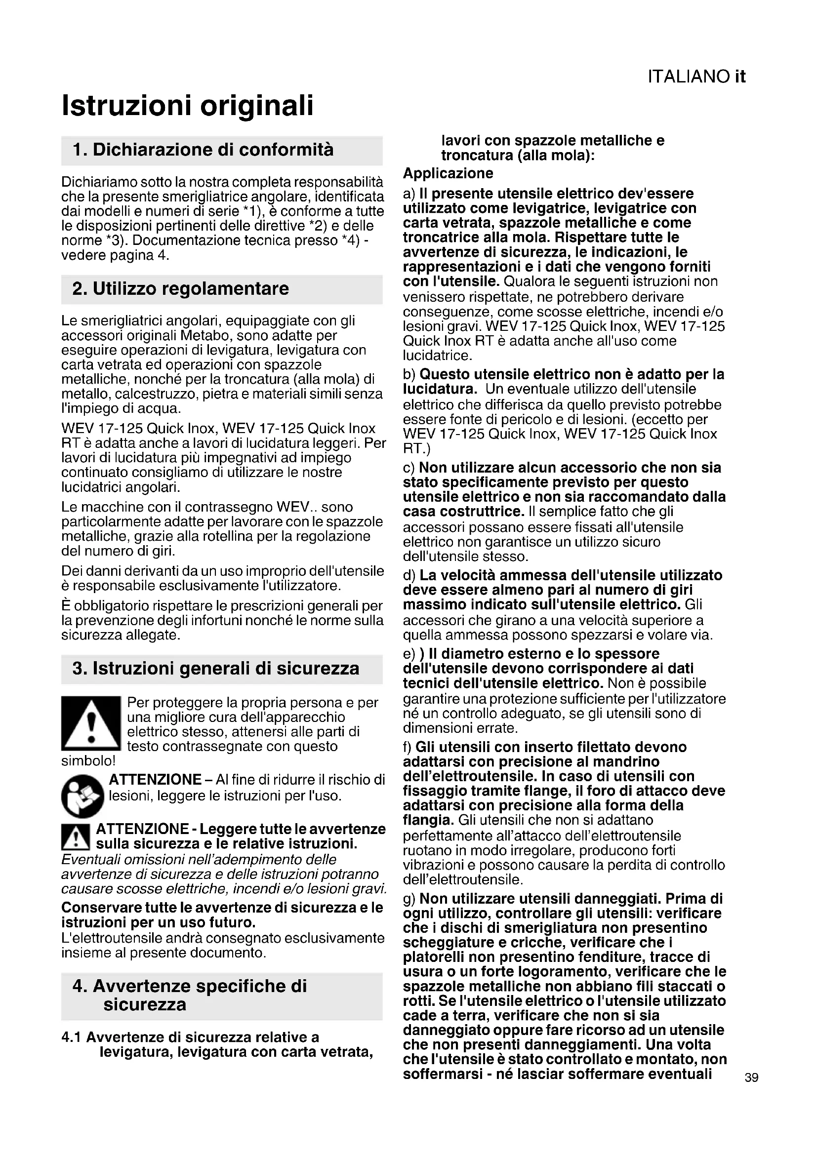 Istruzioni originali Dichiariamo sotto la nostra completa responsabilità che la presente smerigliatrice angolare, identificata dai modelli e numeri di serie *1), è conforme a tutte le disposizioni pertinenti delle direttive *2) e delle norme *3). Documentazione tecnica presso *4) - vedere pagina 4. Le smerigliatrici angolari, equipaggiate con gli accessori originali Metabo, sono adatte per eseguire operazioni di levigatura, levigatura con carta vetrata ed operazioni con spazzole metalliche, nonché per la troncatura (alla mola) di metallo, calcestruzzo, pietra e materiali simili senza l'impiego di acqua. WEV 17-125 Quick Inox, WEV 17-125 Quick Inox RT è adatta anche a lavori di lucidatura leggeri. Per lavori di lucidatura più impegnativi ad impiego continuato consigliamo di utilizzare le nostre lucidatrici angolari. Le macchine con il contrassegno WEV.. sono particolarmente adatte per lavorare con le spazzole metalliche, grazie alla rotellina per la regolazione del numero di giri. Dei danni derivanti da un uso improprio dell'utensile è responsabile esclusivamente l'utilizzatore. È obbligatorio rispettare le prescrizioni generali per la prevenzione degli infortuni nonché le norme sulla sicurezza allegate. Per proteggere la propria persona e per una migliore cura dell'apparecchio elettrico stesso, attenersi alle parti di testo contrassegnate con questo simbolo! ATTENZIONE – Al fine di ridurre il rischio di lesioni, leggere le istruzioni per l'uso. ATTENZIONE - Leggere tutte le avvertenze sulla sicurezza e le relative istruzioni. Eventuali omissioni nell’adempimento delle avvertenze di sicurezza e delle istruzioni potranno causare scosse elettriche, incendi e/o lesioni gravi. Conservare tutte le avvertenze di sicurezza e le istruzioni per un uso futuro. L'elettroutensile andrà consegnato esclusivamente insieme al presente documento.