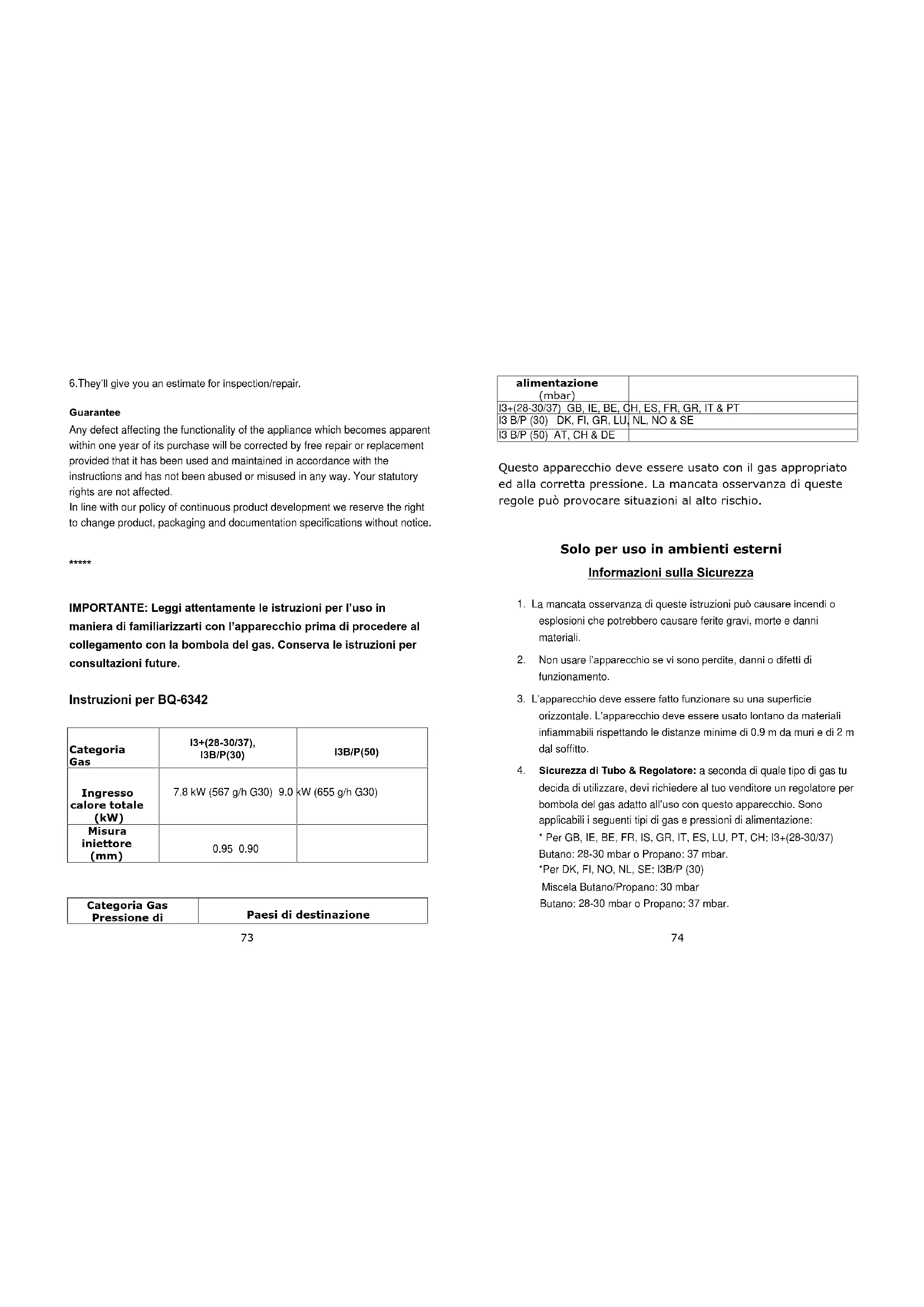 IMPORTANTE: Leggi attentamente le istruzioni per l’uso in maniera di familiarizzarti con l’apparecchio prima di procedere al collegamento con la bombola del gas. Conserva le istruzioni per consultazioni future. Instruzioni per BQ-6342