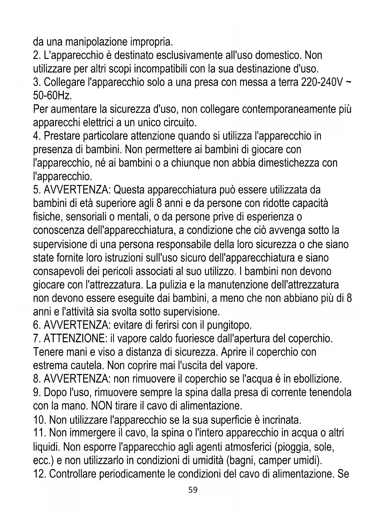 le indicazioni in esse contenute. Il produttore non è responsabile dei danni causati da un uso dell'apparecchio non conforme alla sua destinazione o59 da una manipolazione impropria.