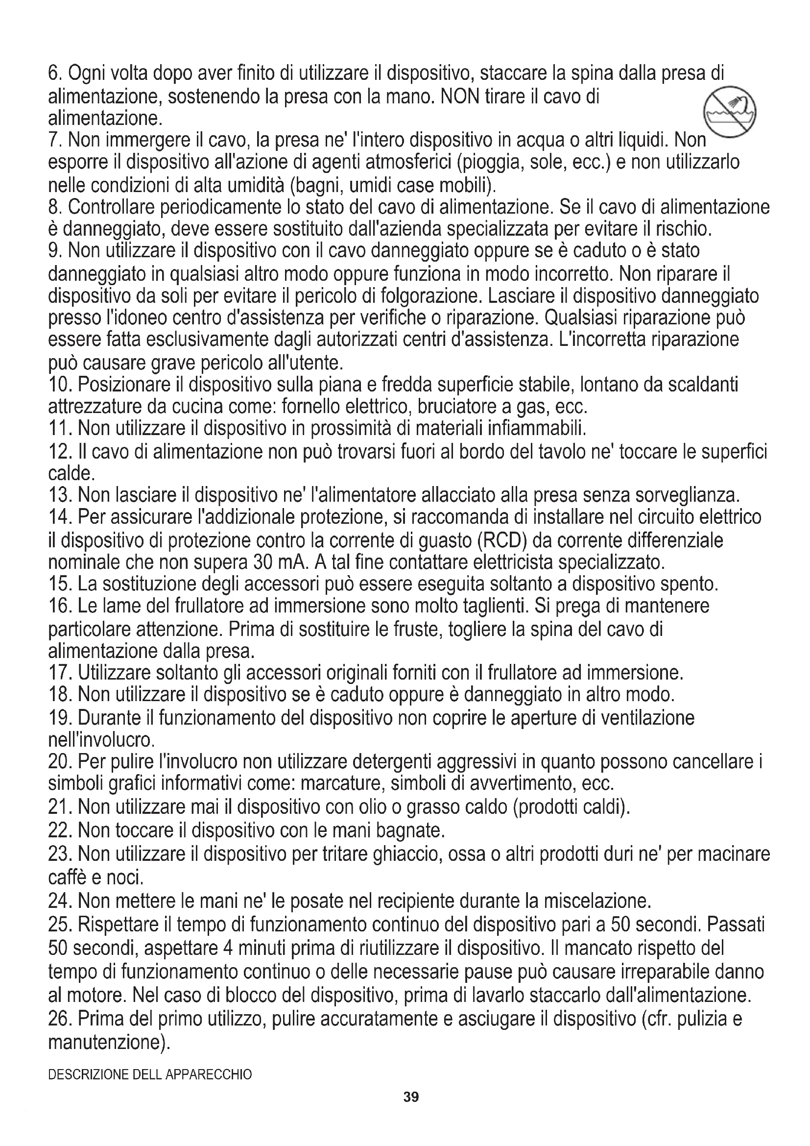 23. Non utilizzare il dispositivo per tritare ghiaccio, ossa o altri prodotti duri ne' per macinare