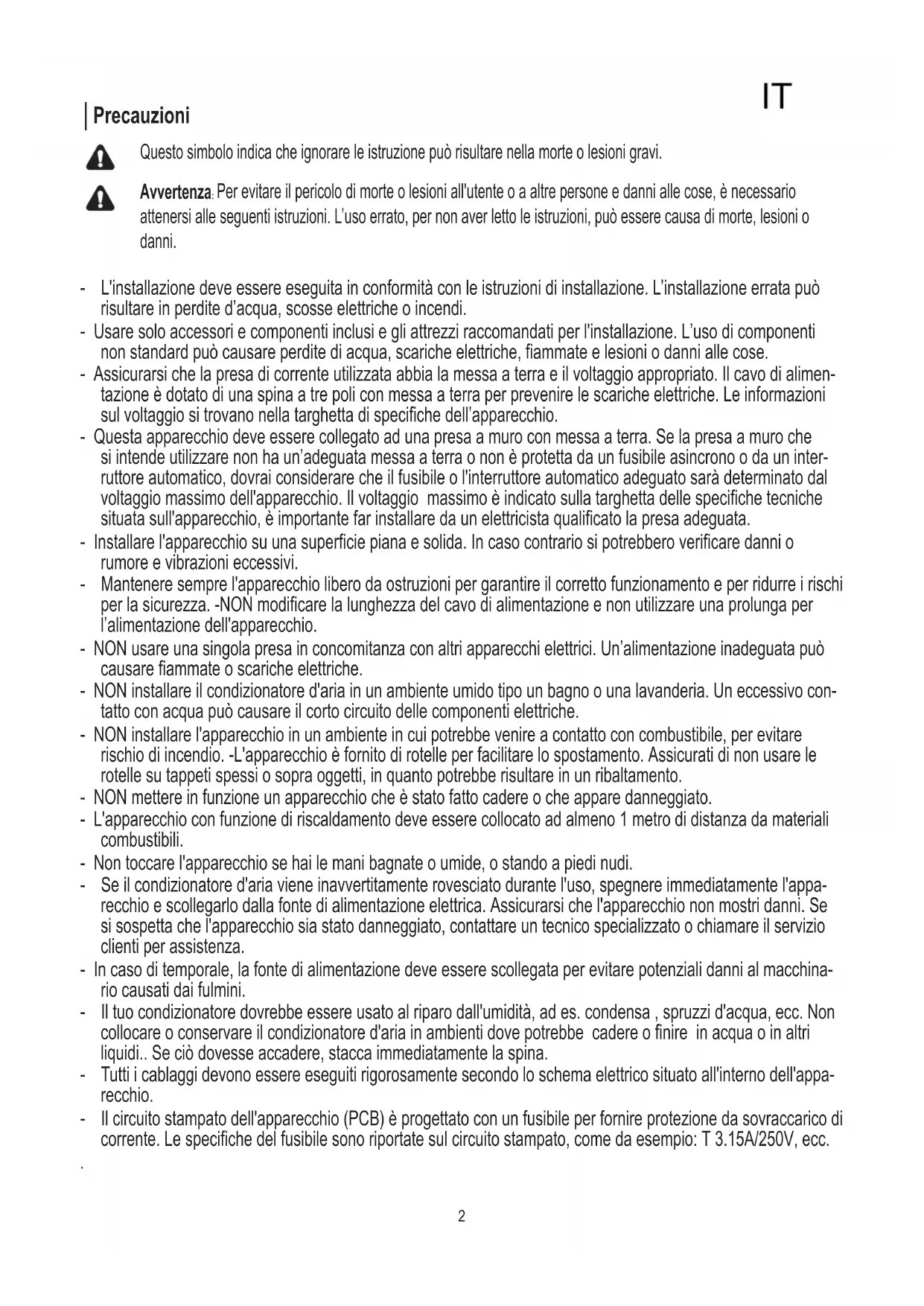 Per evitare il pericolo di morte o lesioni all'utente o a altre persone e danni alle cose, è necessario attenersi alle seguenti istruzioni. L’uso errato, per non aver letto le istruzioni, può essere causa di morte, lesioni o danni. - L'installazione deve essere eseguita in conformità con le istruzioni di installazione. L’installazione errata può risultare in perdite d’acqua, scosse elettriche o incendi. - Usare solo accessori e componenti inclusi e gli attrezzi raccomandati per l'installazione. L’uso di componenti non standard può causare perdite di acqua, scariche elettriche, fiammate e lesioni o danni alle cose. - Assicurarsi che la presa di corrente utilizzata abbia la messa a terra e il voltaggio appropriato. Il cavo di alimen- tazione è dotato di una spina a tre poli con messa a terra per prevenire le scariche elettriche. Le informazioni sul voltaggio si trovano nella targhetta di specifiche dell’apparecchio. - Questa apparecchio deve essere collegato ad una presa a muro con messa a terra. Se la presa a muro che si intende utilizzare non ha un’adeguata messa a terra o non è protetta da un fusibile asincrono o da un inter- ruttore automatico, dovrai considerare che il fusibile o l'interruttore automatico adeguato sarà determinato dal voltaggio massimo dell'apparecchio. Il voltaggio massimo è indicato sulla targhetta delle specifiche tecniche situata sull'apparecchio, è importante far installare da un elettricista qualificato la presa adeguata. - Installare l'apparecchio su una superficie piana e solida. In caso contrario si potrebbero verificare danni o rumore e vibrazioni eccessivi. - Mantenere sempre l'apparecchio libero da ostruzioni per garantire il corretto funzionamento e per ridurre i rischi per la sicurezza. -NON modificare la lunghezza del cavo di alimentazione e non utilizzare una prolunga per l’alimentazione dell'apparecchio. - NON usare una singola presa in concomitanza con altri apparecchi elettrici. Un’alimentazione inadeguata può causare fiammate o scariche elettriche. - NON installare il condizionatore d'aria in un ambiente umido tipo un bagno o una lavanderia. Un eccessivo con- tatto con acqua può causare il corto circuito delle componenti elettriche. - NON installare l'apparecchio in un ambiente in cui potrebbe venire a contatto con combustibile, per evitare rischio di incendio. -L'apparecchio è fornito di rotelle per facilitare lo spostamento. Assicurati di non usare le rotelle su tappeti spessi o sopra oggetti, in quanto potrebbe risultare in un ribaltamento. - NON mettere in funzione un apparecchio che è stato fatto cadere o che appare danneggiato. - L'apparecchio con funzione di riscaldamento deve essere collocato ad almeno 1 metro di distanza da materiali combustibili. - Non toccare l'apparecchio se hai le mani bagnate o umide, o stando a piedi nudi. - Se il condizionatore d'aria viene inavvertitamente rovesciato durante l'uso, spegnere immediatamente l'appa- recchio e scollegarlo dalla fonte di alimentazione elettrica. Assicurarsi che l'apparecchio non mostri danni. Se si sospetta che l'apparecchio sia stato danneggiato, contattare un tecnico specializzato o chiamare il servizio clienti per assistenza. - In caso di temporale, la fonte di alimentazione deve essere scollegata per evitare potenziali danni al macchina- rio causati dai fulmini. - Il tuo condizionatore dovrebbe essere usato al riparo dall'umidità, ad es. condensa , spruzzi d'acqua, ecc. Non collocare o conservare il condizionatore d'aria in ambienti dove potrebbe cadere o finire in acqua o in altri liquidi.. Se ciò dovesse accadere, stacca immediatamente la spina. - Tutti i cablaggi devono essere eseguiti rigorosamente secondo lo schema elettrico situato all'interno dell'appa- recchio. - Il circuito stampato dell'apparecchio (PCB) è progettato con un fusibile per fornire protezione da sovraccarico di corrente. Le specifiche del fusibile sono riportate sul circuito stampato, come da esempio: T 3.15A/250V, ecc.
