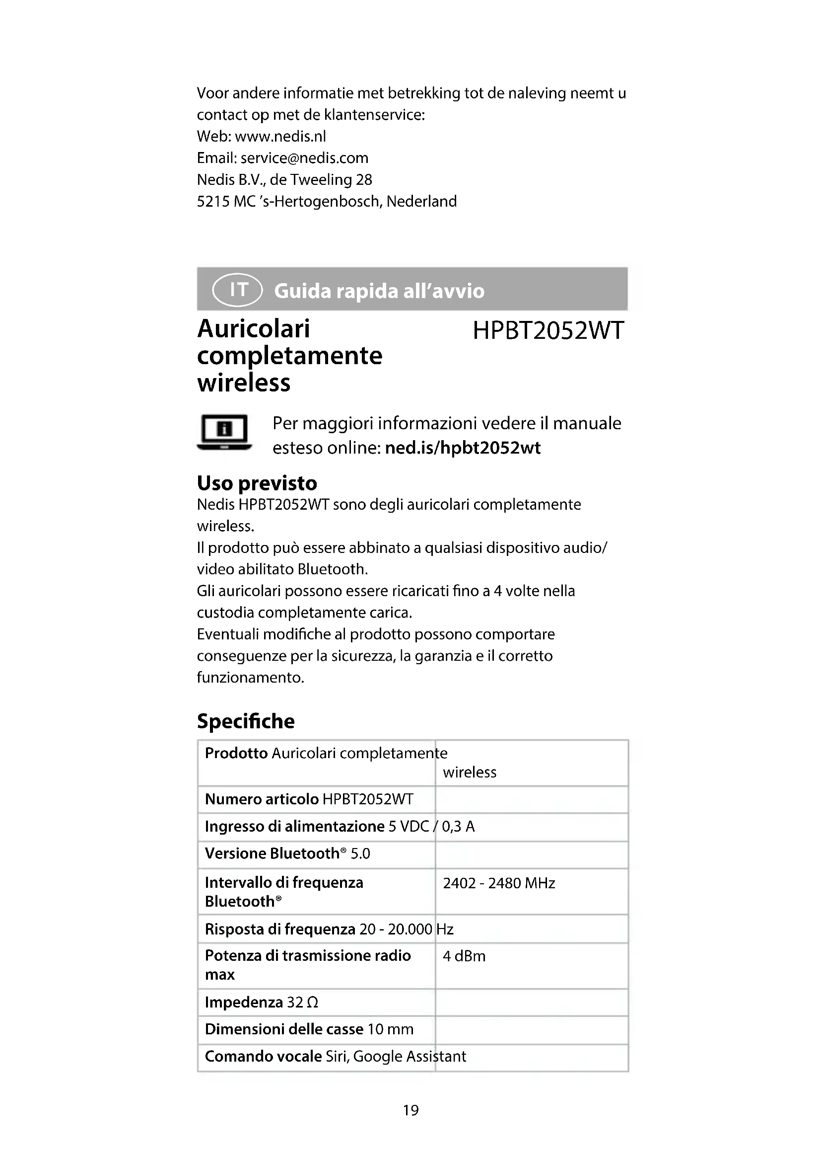 per passare al brano precedente. Utilizzo dell’assistente vocale Tenere premuto A5 o Aq per 3 secondi per attivare Siri/ Google Assistant. Dichiarazione di conformità Noi sottoscritti, Nedis B.V., dichiariamo, in quanto fabbricanti, che il prodotto HPBT2052WT con il nostro marchio Nedis®, prodotto in Cina, è stato collaudato ai sensi di tutte le norme e i regolamenti CE pertinenti e che tutti i collaudi sono stati superati con successo. Questo include, senza esclusione alcuna, la normativa RED 2014/53/UE. La Dichiarazione di conformità completa (e le schede di sicurezza, se applicabili) sono disponibili e possono essere scaricate da: nedis.it/hpbt2052wt#support Per ulteriori informazioni relative alla conformità, contattare il servizio clienti: Sito web: www.nedis.com E-mail: service@nedis.com23 Nedis B.V., de Tweeling 28 5215 MC ’s-Hertogenbosch, Paesi Bassi