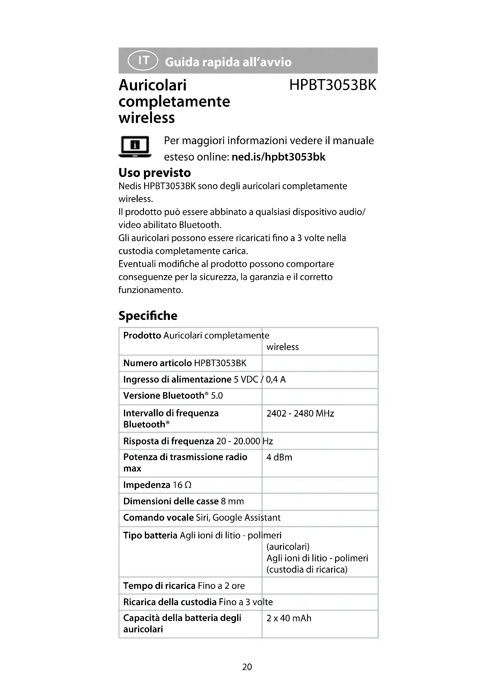Guida rapida all’avvio Auricolari completamente wireless HPBT3053BK Per maggiori informazioni vedere il manuale esteso online: ned.is/hpbt3053bk Uso previsto Nedis HPBT3053BK sono degli auricolari completamente wireless. Il prodotto può essere abbinato a qualsiasi dispositivo audio/ video abilitato Bluetooth. Gli auricolari possono essere ricaricati no a 3 volte nella custodia completamente carica. Eventuali modiche al prodotto possono comportare conseguenze per la sicurezza, la garanzia e il corretto funzionamento. Speciche Prodotto Auricolari completamente wireless Numero articolo HPBT3053BK Ingresso di alimentazione 5 VDC / 0,4 A Versione Bluetooth® 5.0 Intervallo di frequenza Bluetooth® 2402 - 2480 MHz Risposta di frequenza 20 - 20.000 Hz Potenza di trasmissione radio max 4 dBm Impedenza 16 Ω Dimensioni delle casse 8 mm Comando vocale Siri, Google Assistant Tipo batteria Agli ioni di litio - polimeri (auricolari) Agli ioni di litio - polimeri (custodia di ricarica) Tempo di ricarica Fino a 2 ore Ricarica della custodia Fino a 3 volte Capacità della batteria degli auricolari 2 x 40 mAh21 Capacità della batteria della custodia di ricarica 300 mAh Tempo di riproduzione Fino a 3 ore Impermeabile No Comando tattile Sì Parti principali (immagine A)