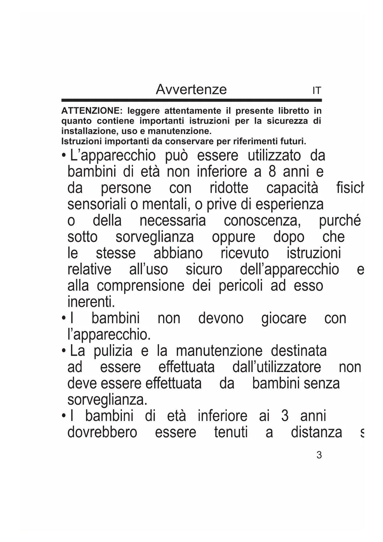 - I bambini di età compresa tra i 3 e gli 8 anni devono solamente accendere/spegnere l’apparecchio purché sia stato posto o installato nella sua normale posizione di funzionamento e che essi ricevano sorveglianza o istruzioni riguardanti l’utilizzo dell’apparecchio in sicurezza e ne capiscano i pericoli.
