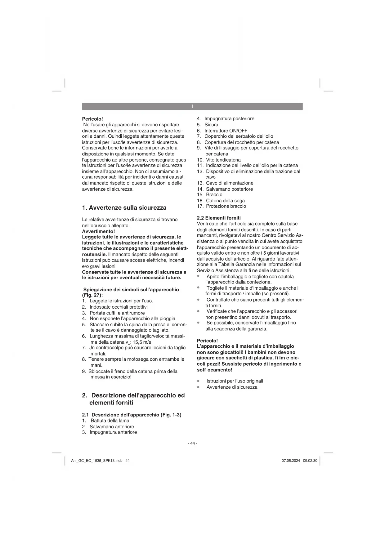 Prima di ogni impiego della motosega controllate i seguenti punti al fi ne di poter lavorare sicuri. Condizioni della catena Esaminate la catena prima di iniziare qualsiasi lavoro assicurandovi che non ci siamo danni all’involucro, al cavo di alimentazione, alla catena e al braccio. Non mettete in esercizio un apparec- chio chiaramente danneggiato. Recipiente dell’olio Livello di riempimento del recipiente dell’olio. Controllate anche mentre state lavorando che ci sia sempre una quantità suffi ciente di olio. Per evitare danni alla motosega, non azionatela mai Anl_GC_EC_1935_SPK13.indb 47Anl_GC_EC_1935_SPK13.indb 47 07.05.2024 09:02:3107.05.2024 09:02:31I