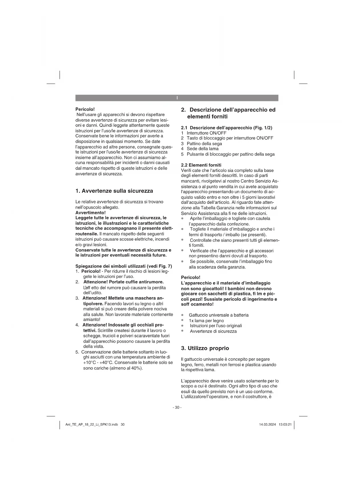 Il gattuccio universale è concepito per segare legno, ferro, metalli non ferrosi e plastica usando la rispettiva lama. L’apparecchio deve venire usato solamente per lo scopo a cui è destinato. Ogni altro tipo di uso che esuli da quello previsto non è un uso conforme. L’utilizzatore/l’operatore, e non il costruttore, è Anl_TE_AP_18_22_Li_SPK13.indb 30Anl_TE_AP_18_22_Li_SPK13.indb 30 14.03.2024 13:03:2114.03.2024 13:03:21I