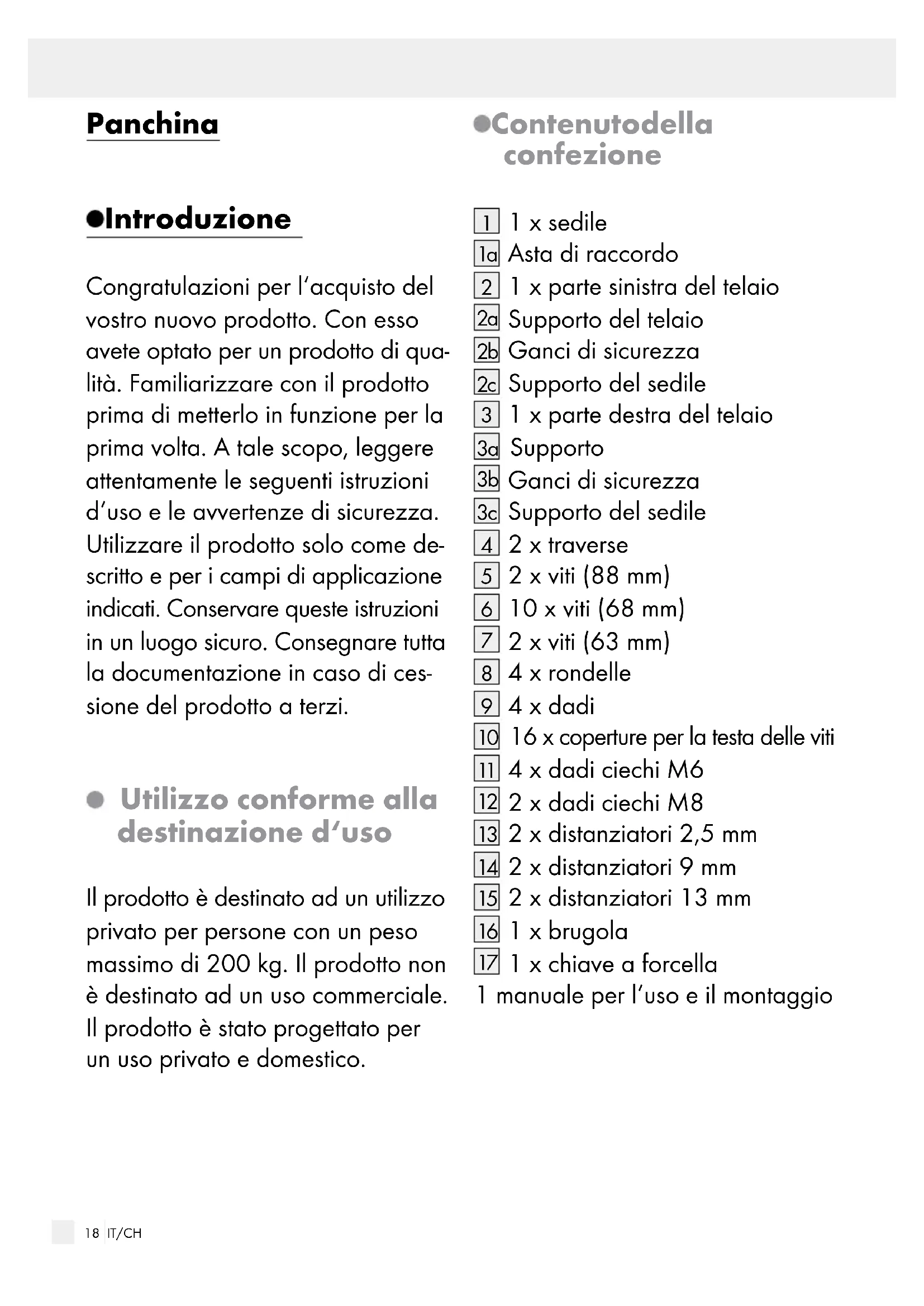 sur des composants fragiles, comme des interrupteurs, des batteries ou des éléments fabriqués en verre.17 IT/CH Introduzione ..........................................................................Pagina 18 Utilizzo conforme alla destinazione d‘uso ................................Pagina 18 Contenuto della confezione .......................................................Pagina 18 Specifiche tecniche ......................................................................Pagina 19 Avvertenze sulla sicurezza .........................................Pagina 19 Montaggio ..............................................................................Pagina 20 Chiusura del prodotto .................................................................Pagina 21 Pulizia e cura .........................................................................Pagina 21 Conservazione .....................................................................Pagina 21 Smaltimento ..........................................................................Pagina 21 Garanzia ..................................................................................Pagina 2218 IT/CH Panchina Introduzione Congratulazioni per l‘acquisto del vostro nuovo prodotto. Con esso avete optato per un prodotto di qua- lità. Familiarizzare con il prodotto prima di metterlo in funzione per la prima volta. A tale scopo, leggere attentamente le seguenti istruzioni d‘uso e le avvertenze di sicurezza. Utilizzare il prodotto solo come de- scritto e per i campi di applicazione indicati. Conservare queste istruzioni in un luogo sicuro. Consegnare tutta la documentazione in caso di ces- sione del prodotto a terzi. Utilizzo conforme alla destinazione d‘uso Il prodotto è destinato ad un utilizzo privato per persone con un peso massimo di 200 kg. Il prodotto non è destinato ad un uso commerciale. Il prodotto è stato progettato per un uso privato e domestico. Contenuto della confezione