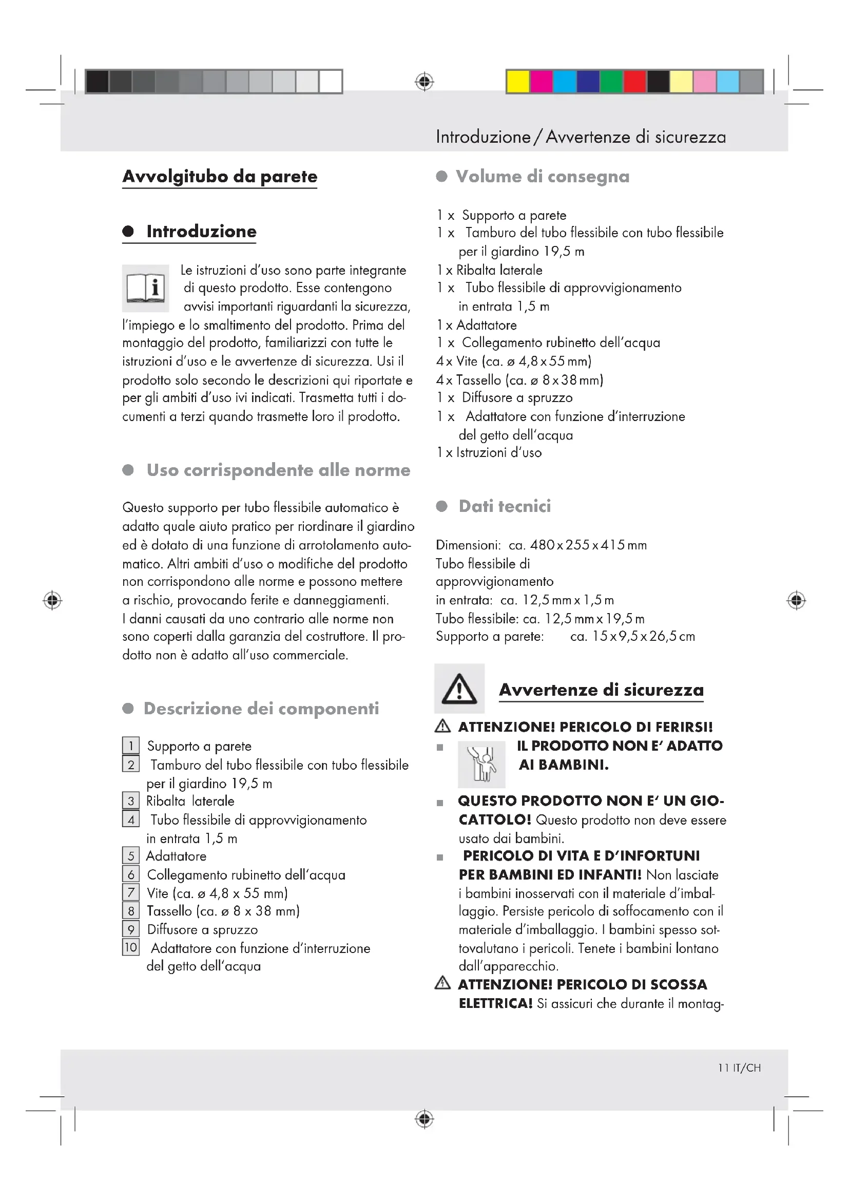 Uso corrispondente alle norme Questo supporto per tubo flessibile automatico è adatto quale aiuto pratico per riordinare il giardino ed è dotato di una funzione di arrotolamento auto- matico. Altri ambiti d’uso o modifiche del prodotto non corrispondono alle norme e possono mettere a rischio, provocando ferite e danneggiamenti. I danni causati da uno contrario alle norme non sono coperti dalla garanzia del costruttore. Il pro- dotto non è adatto all’uso commerciale.