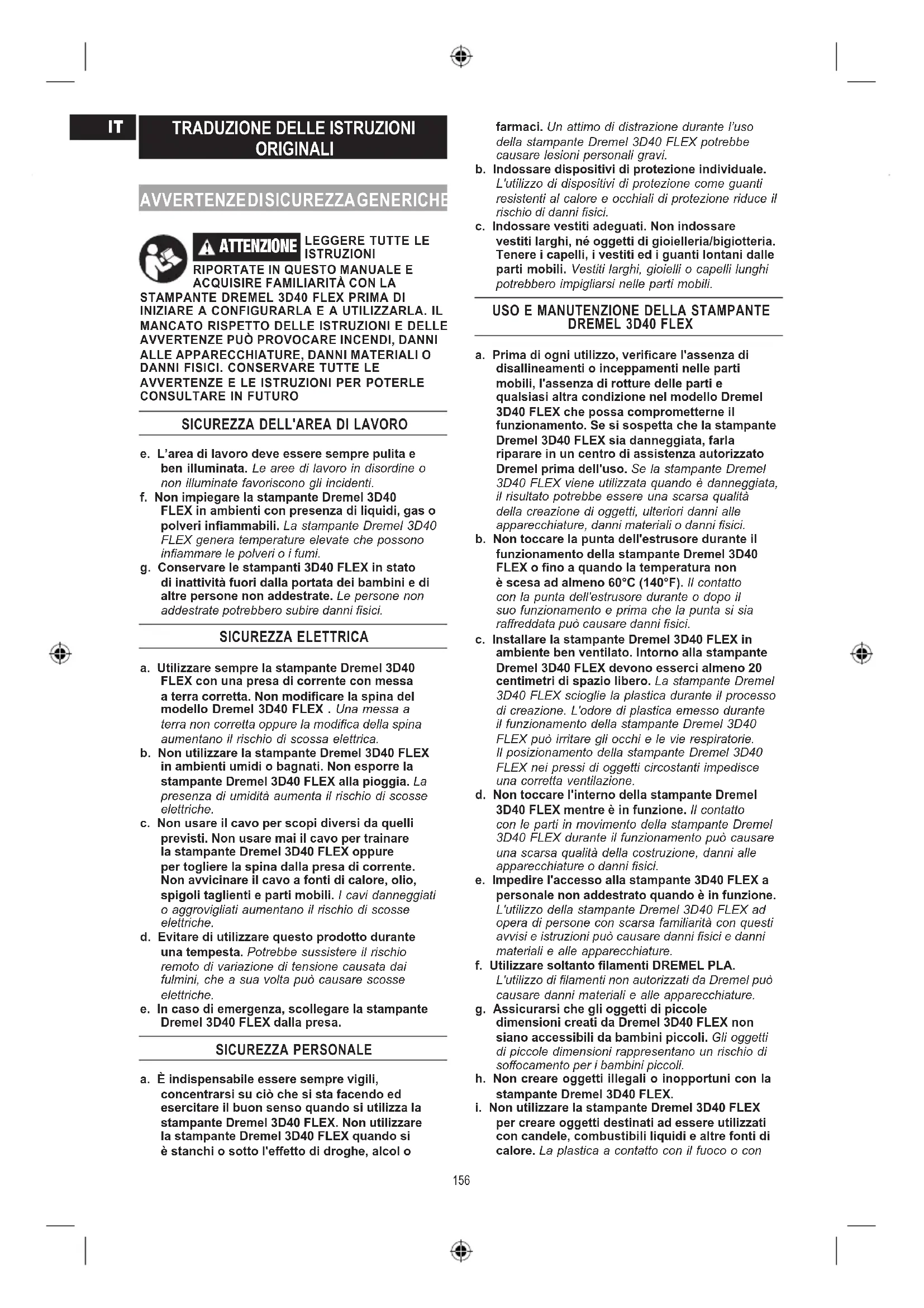 dal supporto in plastica. Il contatto con il bordo della lastra in vetro temperato può causare danni personali. y. Non storcere o piegare il piano di creazione durante la rimozione degli oggetti. La lastra in vetro temperato potrebbe separarsi dal supporto in plastica e causare danni personali. z. Dremel non è responsabile per l'integrità strutturale o l'utilità di oggetti creati con la stampante Dremel 3D40 FLEX. Modelli strutturali creati da designer inesperti possono provocare danni materiali e danni sici. MANUTENZIONE a. Scollegare sempre la stampante Dremel 3D40 FLEX dall'alimentazione prima di svolgere qualsiasi procedura di manutenzione. Il mancato rispetto di questa avvertenza potrebbe causare danni sici e alle apparecchiature. b. Fare in modo che la stampante Dremel 3D40 FLEX venga riparata soltanto da centri di assistenza autorizzati Dremel e soltanto con parti di ricambio Dremel. Tale condizione garantisce il corretto funzionamento e la sicurezza della stampante Dremel 3D40 FLEX. c. Utilizzare soltanto materiali e componenti Dremel approvati. L'utilizzo di materiali per l'oggetto o di oggetti 3D che non siano materiali approvati Dremel
