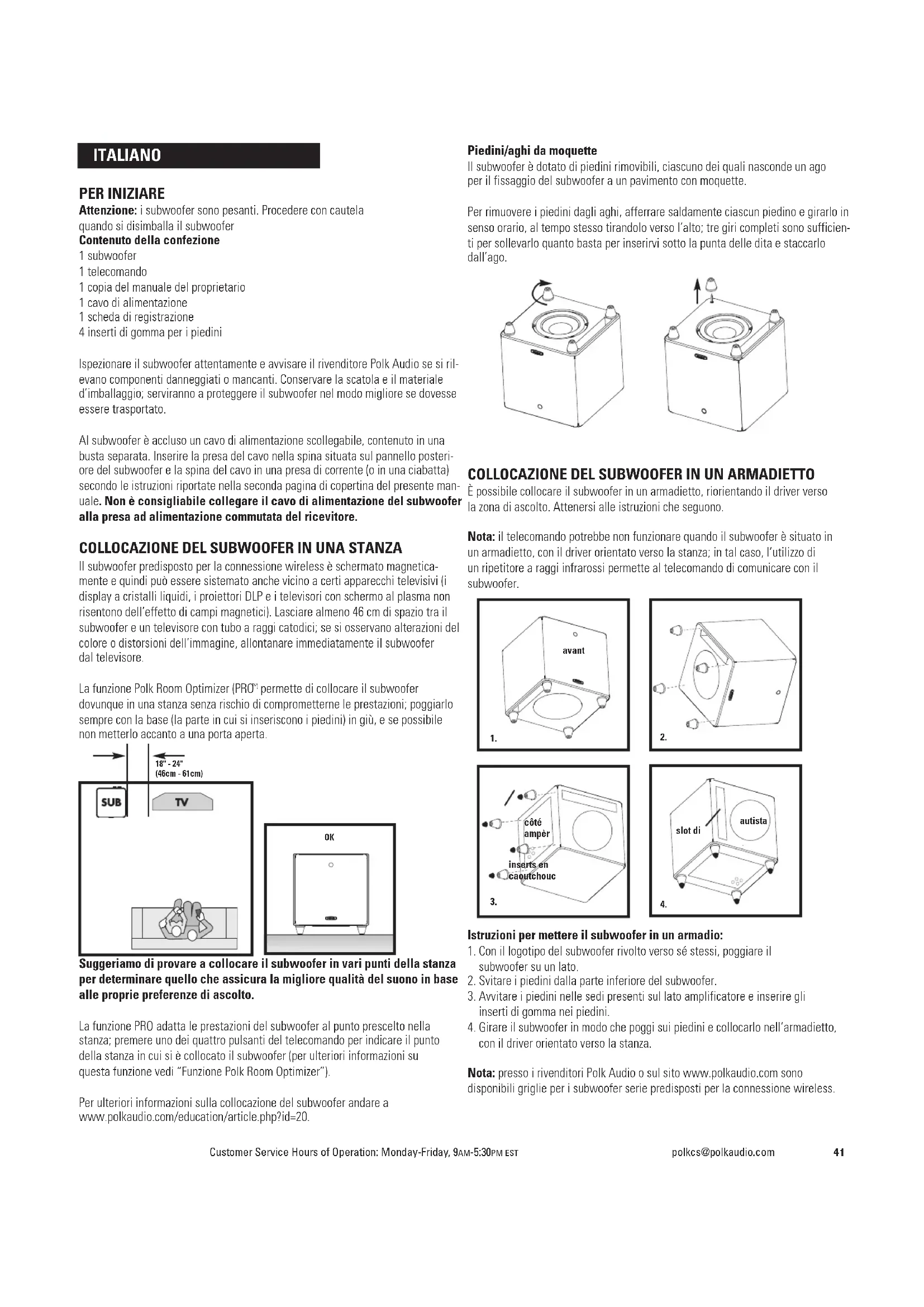 permette di collocare il subwoofer dovunque in una stanza senza rischio di comprometterne le prestazioni; poggiarlo sempre con la base (la parte in cui si inseriscono i piedini) in giù, e se possibile non metterlo accanto a una porta aperta. Suggeriamo di provare a collocare il subwoofer in vari punti della stanza per determinare quello che assicura la migliore qualità del suono in base alle proprie preferenze di ascolto. La funzione PRO adatta le prestazioni del subwoofer al punto prescelto nella stanza; premere uno dei quattro pulsanti del telecomando per indicare il punto della stanza in cui si è collocato il subwoofer (per ulteriori informazioni su questa funzione vedi “Funzione Polk Room Optimizer”). Per ulteriori informazioni sulla collocazione del subwoofer andare a www.polkaudio.com/education/article.php?id=20. Piedini/aghi da moquette Il subwoofer è dotato di piedini rimovibili, ciascuno dei quali nasconde un ago per il fissaggio del subwoofer a un pavimento con moquette. Per rimuovere i piedini dagli aghi, afferrare saldamente ciascun piedino e girarlo in senso orario, al tempo stesso tirandolo verso l’alto; tre giri completi sono sufficien- ti per sollevarlo quanto basta per inserirvi sotto la punta delle dita e staccarlo