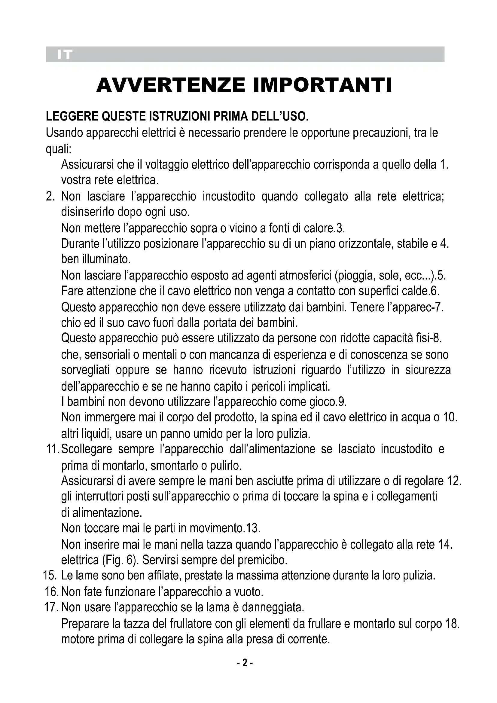 AVVERTENZE IMPORTANTI LEGGERE QUESTE ISTRUZIONI PRIMA DELL’USO. Usando apparecchi elettrici è necessario prendere le opportune precauzioni, tra le quali: Assicurarsi che il voltaggio elettrico dell’apparecchio corrisponda a quello della 1. vostra rete elettrica. Non lasciare l’apparecchio incustodito quando collegato alla rete elettrica; 2. disinserirlo dopo ogni uso. Non mettere l’apparecchio sopra o vicino a fonti di calore.3. Durante l’utilizzo posizionare l’apparecchio su di un piano orizzontale, stabile e 4. ben illuminato. Non lasciare l’apparecchio esposto ad agenti atmosferici (pioggia, sole, ecc...).5. Fare attenzione che il cavo elettrico non venga a contatto con superfici calde.6. Questo apparecchio non deve essere utilizzato dai bambini. Tenere l’apparec-7. chio ed il suo cavo fuori dalla portata dei bambini. Questo apparecchio può essere utilizzato da persone con ridotte capacità fisi-8. che, sensoriali o mentali o con mancanza di esperienza e di conoscenza se sono sorvegliati oppure se hanno ricevuto istruzioni riguardo l’utilizzo in sicurezza dell’apparecchio e se ne hanno capito i pericoli implicati. I bambini non devono utilizzare l’apparecchio come gioco.9. Non immergere mai il corpo del prodotto, la spina ed il cavo elettrico in acqua o 10. altri liquidi, usare un panno umido per la loro pulizia. Scollegare sempre l’apparecchio dall’alimentazione se lasciato incustodito e 11. prima di montarlo, smontarlo o pulirlo. Assicurarsi di avere sempre le mani ben asciutte prima di utilizzare o di regolare 12. gli interruttori posti sull’apparecchio o prima di toccare la spina e i collegamenti di alimentazione. Non toccare mai le parti in movimento.13. Non inserire mai le mani nella tazza quando l’apparecchio è collegato alla rete 14. elettrica (Fig. 6). Servirsi sempre del premicibo. Le lame sono ben affilate, prestate la massima attenzione durante la loro pulizia.15. Non fate funzionare l’apparecchio a vuoto.16. Non usare l’apparecchio se la lama è danneggiata.17. Preparare la tazza del frullatore con gli elementi da frullare e montarlo sul corpo 18. motore prima di collegare la spina alla presa di corrente.IT