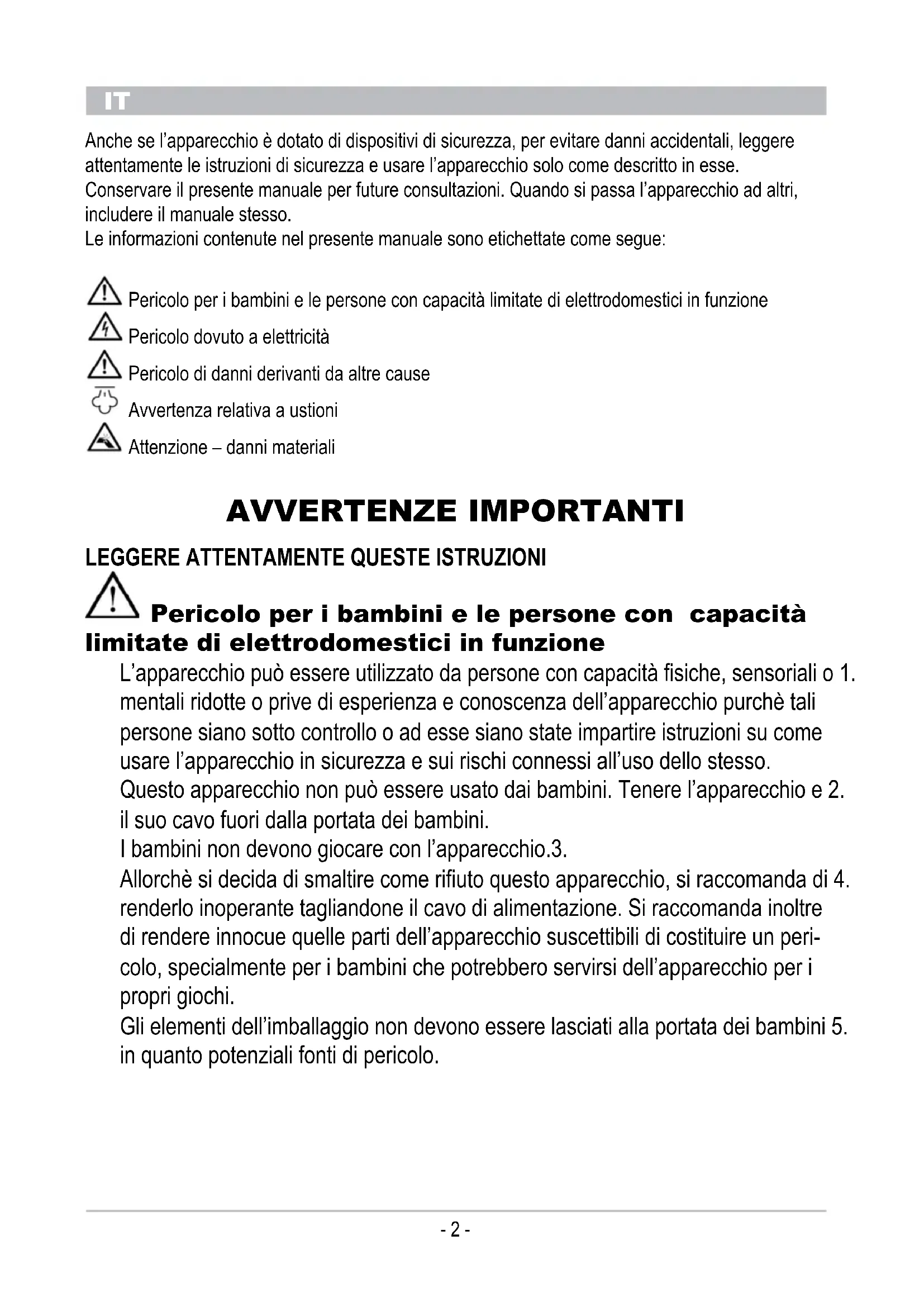 Anche se l’apparecchio è dotato di dispositivi di sicurezza, per evitare danni accidentali, leggere attentamente le istruzioni di sicurezza e usare l’apparecchio solo come descritto in esse. Conservare il presente manuale per future consultazioni. Quando si passa l’apparecchio ad altri, includere il manuale stesso. Le informazioni contenute nel presente manuale sono etichettate come segue: Pericolo per i bambini e le persone con capacità limitate di elettrodomestici in funzione Pericolo dovuto a elettricità Pericolo di danni derivanti da altre cause Avvertenza relativa a ustioni Attenzione – danni materiali AVVERTENZE IMPORTANTI lEGGERE AttENtAMENtE QuEstE IstRuzIONI Pericolo per i bambini e le persone con capacità limitate di elettrodomestici in funzione L’apparecchio può essere utilizzato da persone con capacità fisiche, sensoriali o 1. mentali ridotte o prive di esperienza e conoscenza dell’apparecchio purchè tali persone siano sotto controllo o ad esse siano state impartire istruzioni su come usare l’apparecchio in sicurezza e sui rischi connessi all’uso dello stesso. Questo apparecchio non può essere usato dai bambini. Tenere l’apparecchio e 2. il suo cavo fuori dalla portata dei bambini. I bambini non devono giocare con l’apparecchio.3. Allorchè si decida di smaltire come rifiuto questo apparecchio, si raccomanda di 4. renderlo inoperante tagliandone il cavo di alimentazione. Si raccomanda inoltre di rendere innocue quelle parti dell’apparecchio suscettibili di costituire un peri- colo, specialmente per i bambini che potrebbero servirsi dell’apparecchio per i propri giochi. Gli elementi dell’imballaggio non devono essere lasciati alla portata dei bambini 5. in quanto potenziali fonti di pericolo.IT