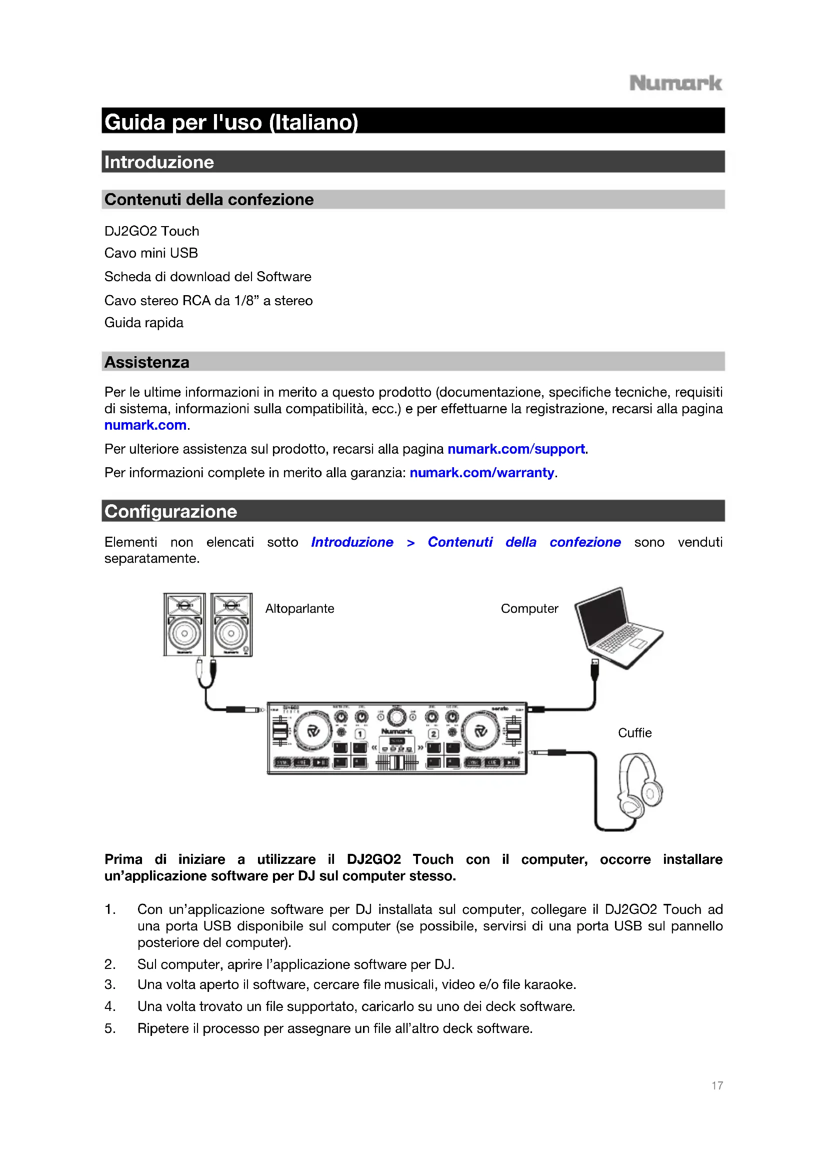 Guida per l'uso (Italiano) Introduzione Contenuti della confezione DJ2GO2 Touch Cavo mini USB Scheda di download del Software Cavo stereo RCA da 1/8” a stereo Guida rapida Assistenza Per le ultime informazioni in merito a questo prodotto (documentazione, specifiche tecniche, requisiti di sistema, informazioni sulla compatibilità, ecc.) e per effettuarne la registrazione, recarsi alla pagina numark.com. Per ulteriore assistenza sul prodotto, recarsi alla pagina numark.com/support. Per informazioni complete in merito alla garanzia: numark.com/warranty. Configurazione Elementi non elencati sotto Introduzione > Contenuti della confezione sono venduti separatamente.